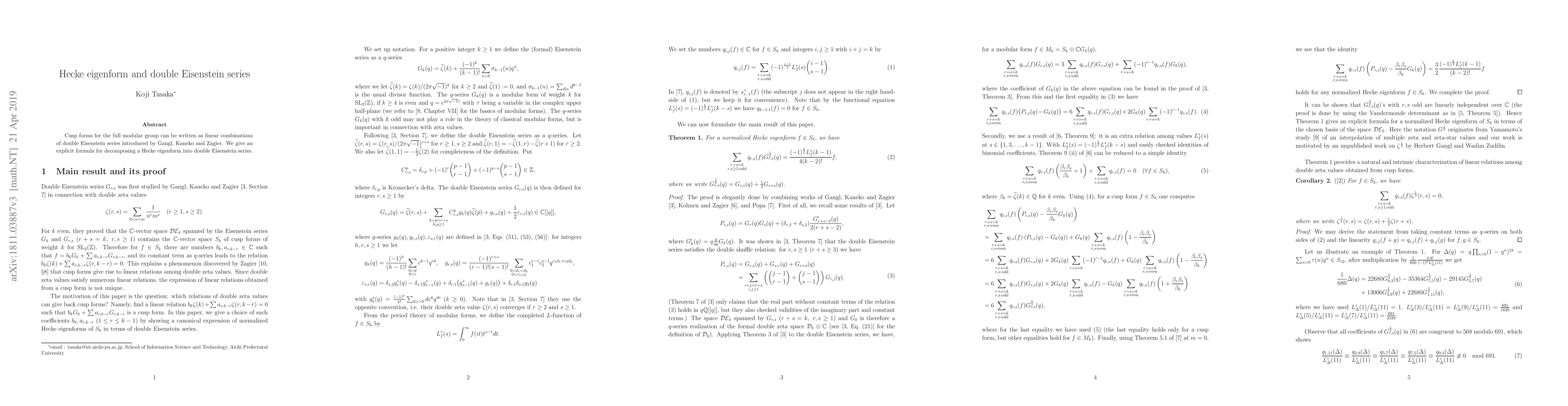 Summary: The paper provides an explicit formula for decomposing a Hecke eigenform into double Eisenstein series, which are introduced by Gangl, Kaneko, and Zagier for cusp forms of the full modular group. This decomposition bridges the relationship between eigenforms and Eisenstein series.