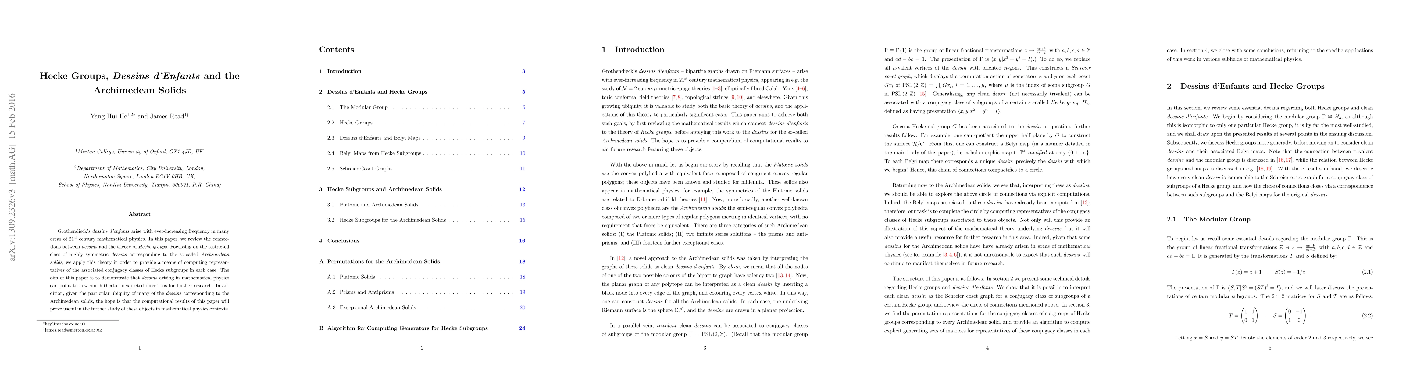 Researchers connect Hecke groups to Grothendieck's dessins d'enfants, specifically those related to Archimedean solids, providing a new method for computing conjugacy classes of Hecke subgroups in mathematical physics.