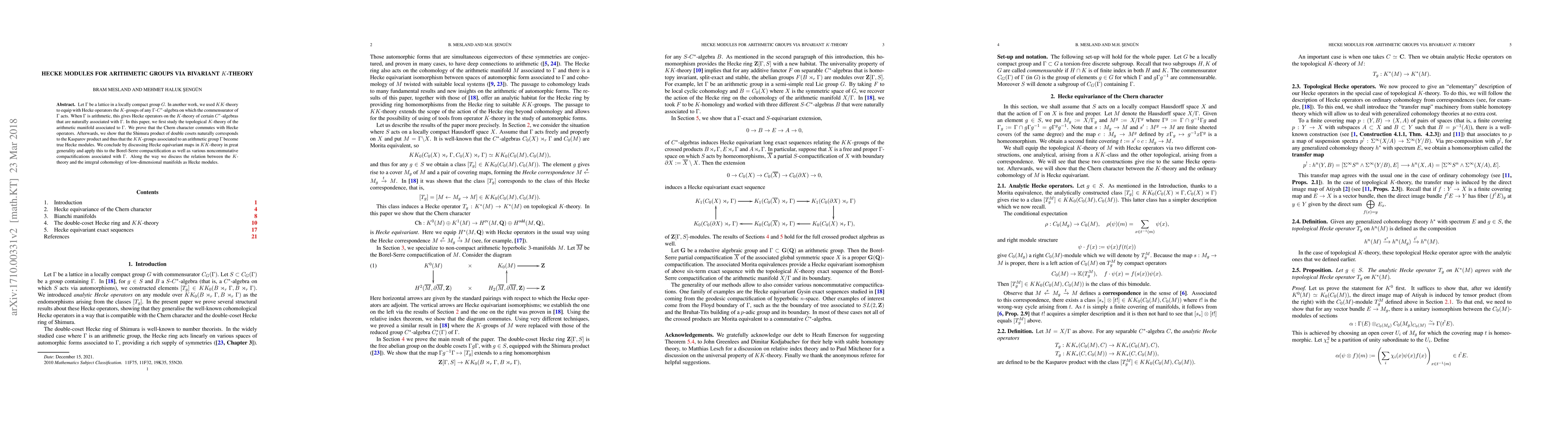 Let $\Gamma$ be a lattice in a locally compact group $G$. In earlier work, we used $KK$-theory to equip the $K$-groups of any $\Gamma$-$C^{*}$-algebra on which the commensurator of $\Gamma$ acts with Hecke operators. When $\Gamma$ is arithmetic, this gives Hecke operators on the $K$-theory of certain $C^{*}$-algebras that are naturally associated with $\Gamma$. In this paper, we first study the topological $K$-theory of the arithmetic manifold associated to $\Gamma$. We prove that the Chern character commutes with Hecke operators. Afterwards, we show that the Shimura product of double cosets naturally corresponds to the Kasparov product and thus that the $KK$-groups associated to an arithmetic group $\Gamma$ become true Hecke modules. We conclude by discussing Hecke equivariant maps in $KK$-theory in great generality and apply this to the Borel-Serre compactification as well as various noncommutative compactifications associated with $\Gamma$. Along the way we discuss the relation between the $K$-theory and the integral cohomology of low-dimensional manifolds as Hecke modules.