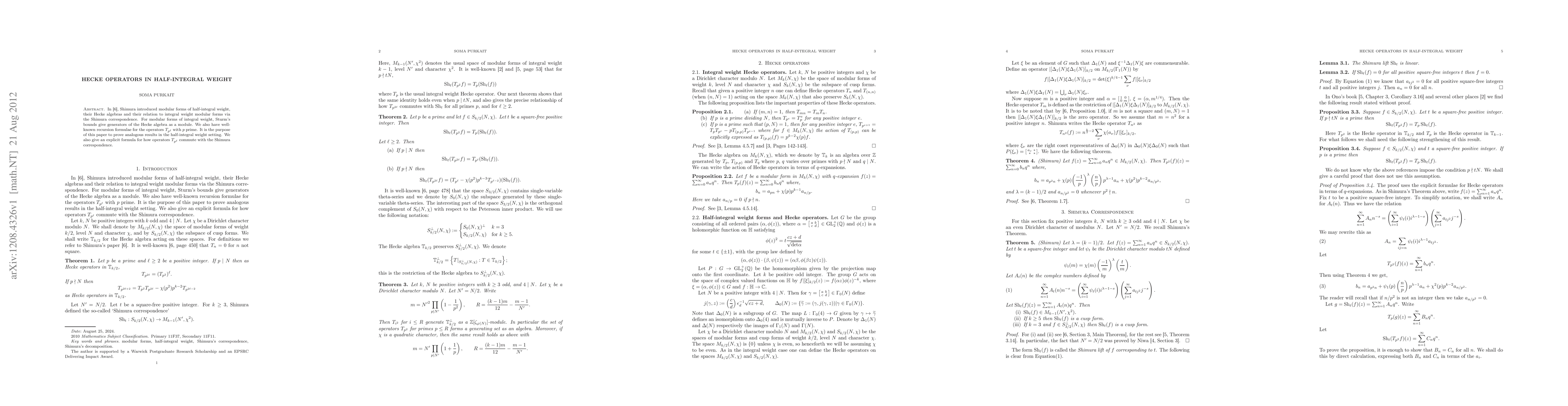 This paper proves analogous results for Hecke operators in modular forms of half-integral weight, extending Sturm's bounds and recursion formulae from integral weight modular forms. It also provides an explicit formula for the commutation of $T_{p^\ell}$ operators with the Shimura correspondence.