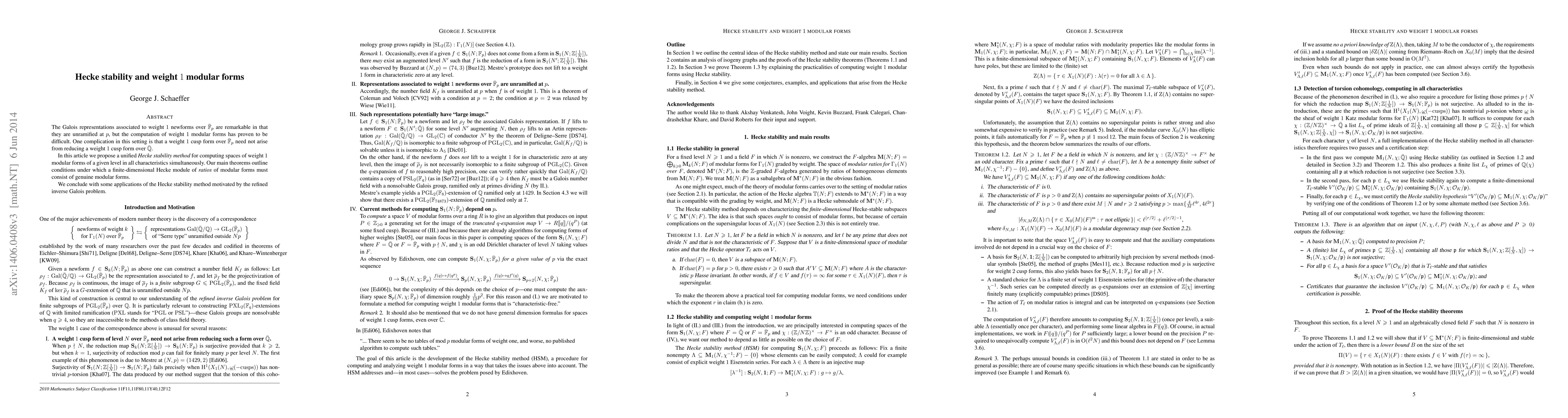 The research employs a Hecke stability method to compute spaces of weight 1 modular forms simultaneously across all characteristics, proposing conditions under which a finite-dimensional Hecke module consists of genuine modular forms.