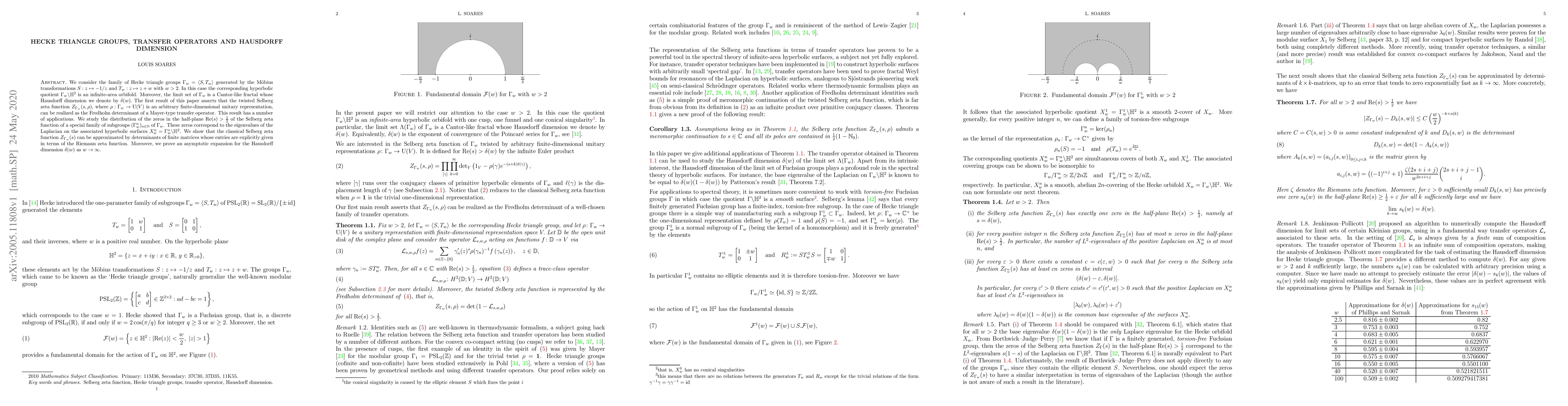 We consider the family of Hecke triangle groups $ \Gamma_{w} = \langle S, T_w\rangle $ generated by the M\"obius transformations $ S : z\mapsto -1/z $ and $ T_{w} : z \mapsto z+w $ with $ w > 2.$ In this case the corresponding hyperbolic quotient $ \Gamma_{w}\backslash\mathbb{H}^2 $ is an infinite-area orbifold. Moreover, the limit set of $ \Gamma_w $ is a Cantor-like fractal whose Hausdorff dimension we denote by $ \delta(w). $ The first result of this paper asserts that the twisted Selberg zeta function $ Z_{\Gamma_{ w}}(s, \rho) $, where $ \rho : \Gamma_{w} \to \mathrm{U}(V) $ is an arbitrary finite-dimensional unitary representation, can be realized as the Fredholm determinant of a Mayer-type transfer operator. This result has a number of applications. We study the distribution of the zeros in the half-plane $\mathrm{Re}(s) > \frac{1}{2}$ of the Selberg zeta function of a special family of subgroups $( \Gamma_w^n )_{n\in \mathbb{N}} $ of $\Gamma_w$. These zeros correspond to the eigenvalues of the Laplacian on the associated hyperbolic surfaces $X_w^n = \Gamma_w^n \backslash \mathbb{H}^2$. We show that the classical Selberg zeta function $Z_{\Gamma_w}(s)$ can be approximated by determinants of finite matrices whose entries are explicitly given in terms of the Riemann zeta function. Moreover, we prove an asymptotic expansion for the Hausdorff dimension $\delta(w)$ as $w\to \infty$.