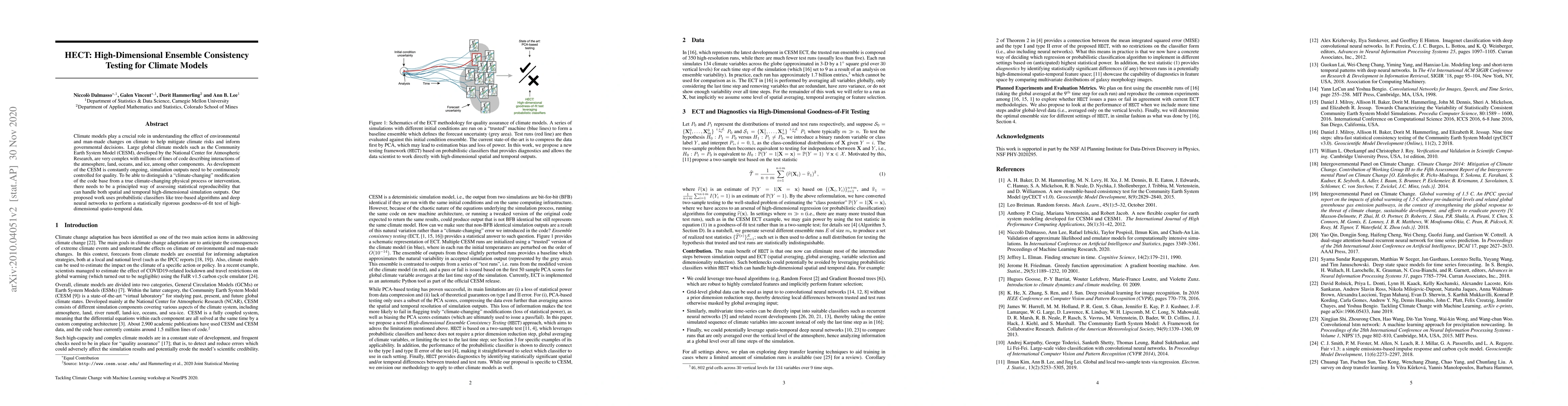 Climate models play a crucial role in understanding the effect of environmental and man-made changes on climate to help mitigate climate risks and inform governmental decisions. Large global climate models such as the Community Earth System Model (CESM), developed by the National Center for Atmospheric Research, are very complex with millions of lines of code describing interactions of the atmosphere, land, oceans, and ice, among other components. As development of the CESM is constantly ongoing, simulation outputs need to be continuously controlled for quality. To be able to distinguish a "climate-changing" modification of the code base from a true climate-changing physical process or intervention, there needs to be a principled way of assessing statistical reproducibility that can handle both spatial and temporal high-dimensional simulation outputs. Our proposed work uses probabilistic classifiers like tree-based algorithms and deep neural networks to perform a statistically rigorous goodness-of-fit test of high-dimensional spatio-temporal data.