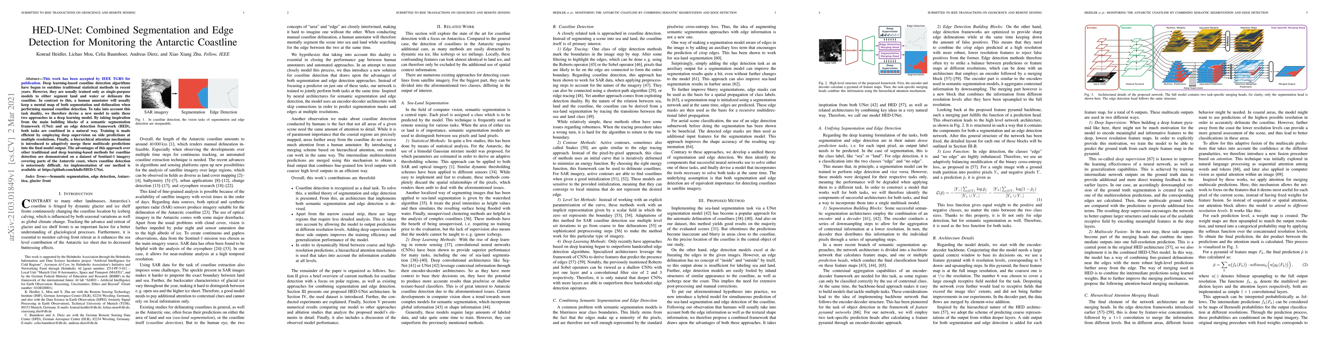 The HED-UNet model combines semantic segmentation and edge detection for improved Antarctic coastline monitoring. It integrates UNet and HED frameworks with deep supervision and hierarchical attention for efficient training and multiscale prediction merging, outperforming traditional and other deep learning methods on Sentinel-1 imagery.