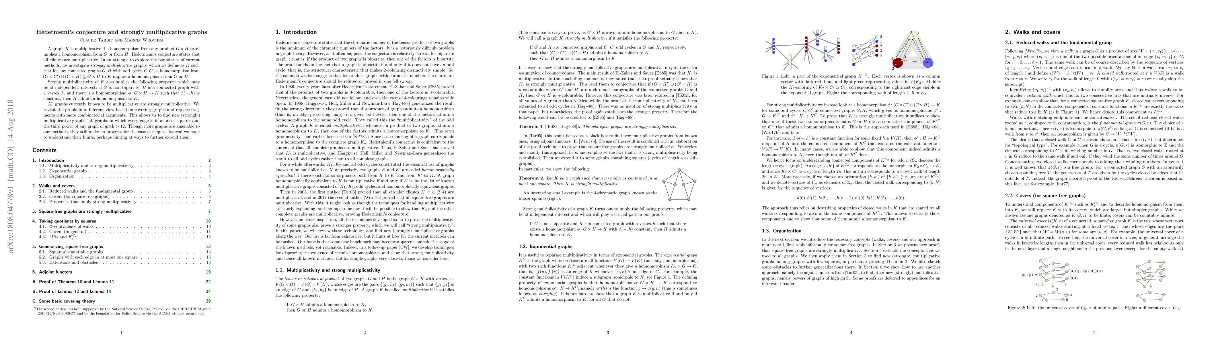 A graph K is multiplicative if a homomorphism from any product G x H to K implies a homomorphism from G or from H. Hedetniemi's conjecture states that all cliques are multiplicative. In an attempt to explore the boundaries of current methods, we investigate strongly multiplicative graphs, which we define as K such that for any connected graphs G,H with odd cycles C,C', a homomorphism from $(G \times C') \cup (C \times H) \subseteq G \times H$ to K implies a homomorphism from G or H. Strong multiplicativity of K also implies the following property, which may be of independent interest: if G is non-bipartite, H is a connected graph with a vertex h, and there is a homomorphism $\phi \colon G \times H \to K$ such that $\phi(-,h)$ is constant, then H admits a homomorphism to K. All graphs currently known to be multiplicative are strongly multiplicative. We revisit the proofs in a different view based on covering graphs and replace fragments with more combinatorial arguments. This allows us to find new (strongly) multiplicative graphs: all graphs in which every edge is in at most square, and the third power of any graph of girth >12. Though more graphs are amenable to our methods, they still make no progress for the case of cliques. Instead we hope to understand their limits, perhaps hinting at ways to further extend them.