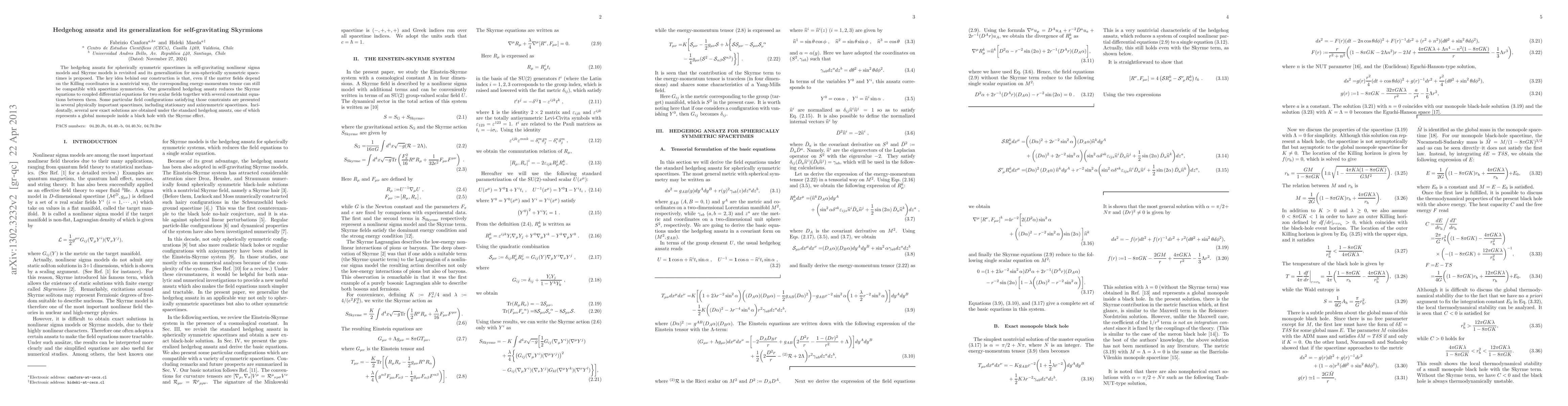 The paper revisits the hedgehog ansatz for self-gravitating Skyrmions and proposes a generalization for non-spherically symmetric spacetimes. The new ansatz reduces the Skyrme equations to coupled differential equations for scalar fields and constraint equations, yielding new exact solutions including a global monopole inside a black hole.