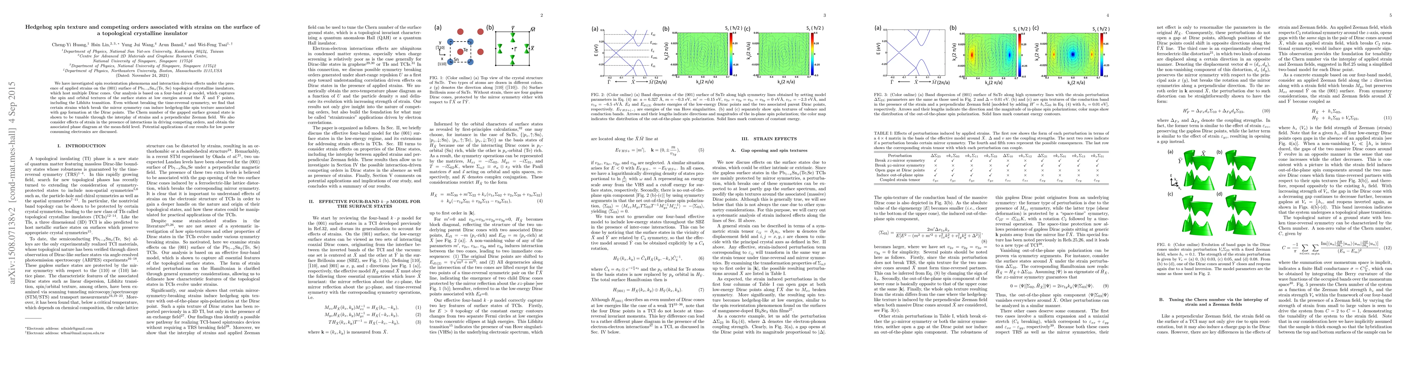 We have investigated spin reorientation phenomena and interaction driven effects under the presence of applied strains on the (001) surface of Pb$_{1-x}$Sn$_x$(Te, Se) topological crystalline insulators, which host multiple Dirac cones. Our analysis is based on a four-band $k\cdot p$ model, which captures the spin and orbital textures of the surface states at low energies around the $\bar{X}$ and $\bar{Y}$ points, including the Lifshitz transition. Even without breaking the time-reversal symmetry, we find that certain strains which break the mirror symmetry can induce hedgehog-like spin texture associated with gap formation at the Dirac points. The Chern number of the gapped surface ground state is shown to be tunable through the interplay of strains and a perpendicular Zeeman field. We also consider effects of strain in the presence of interactions in driving competing orders, and obtain the associated phase diagram at the mean-field level. Potential applications of our results for low power consuming electronics are discussed.