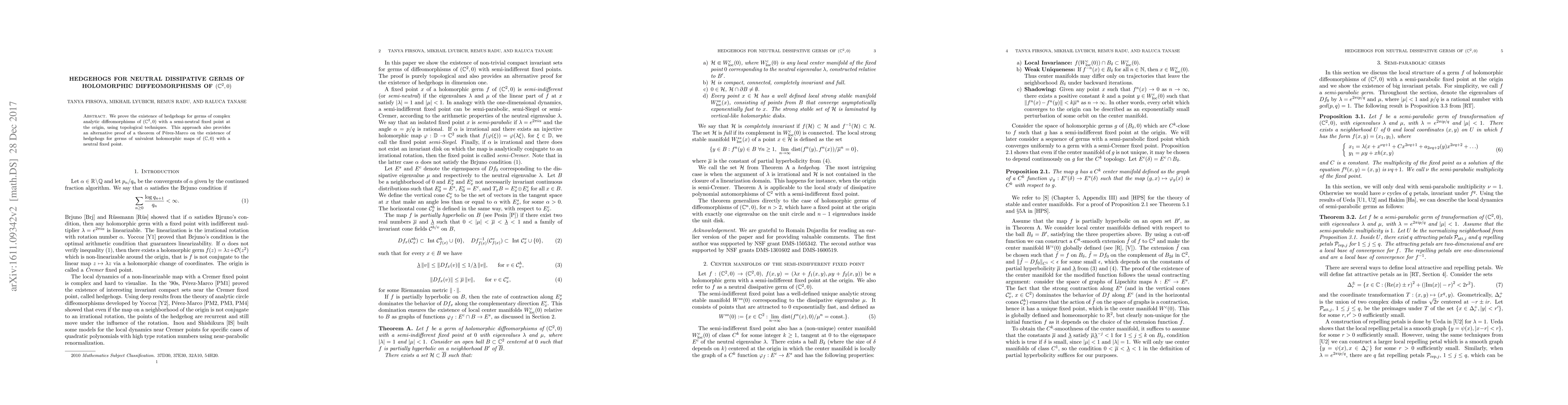 This paper proves the existence of hedgehogs for complex analytic diffeomorphisms of $(\mathbb{C}^{2},0)$ with a semi-neutral fixed point, employing topological techniques, and offers an alternative proof for a related theorem concerning univalent holomorphic maps of $(\mathbb{C},0)$.