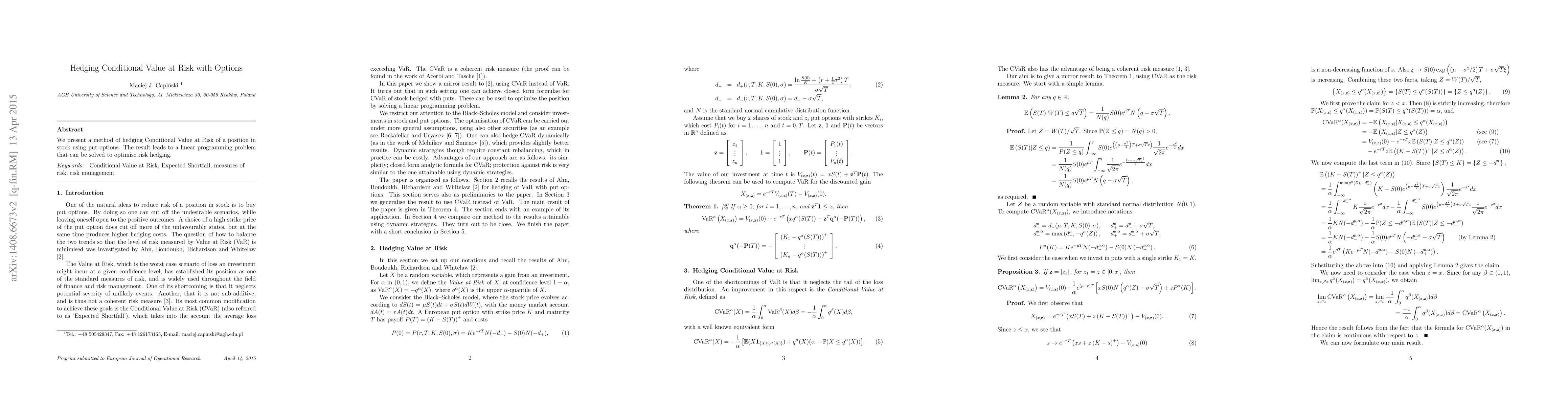 Summary: This paper proposes a method for hedging Conditional Value at Risk (CVaR) of a stock position using put options, resulting in a linear programming problem that optimizes risk hedging. The approach aims to minimize potential losses under adverse market conditions.