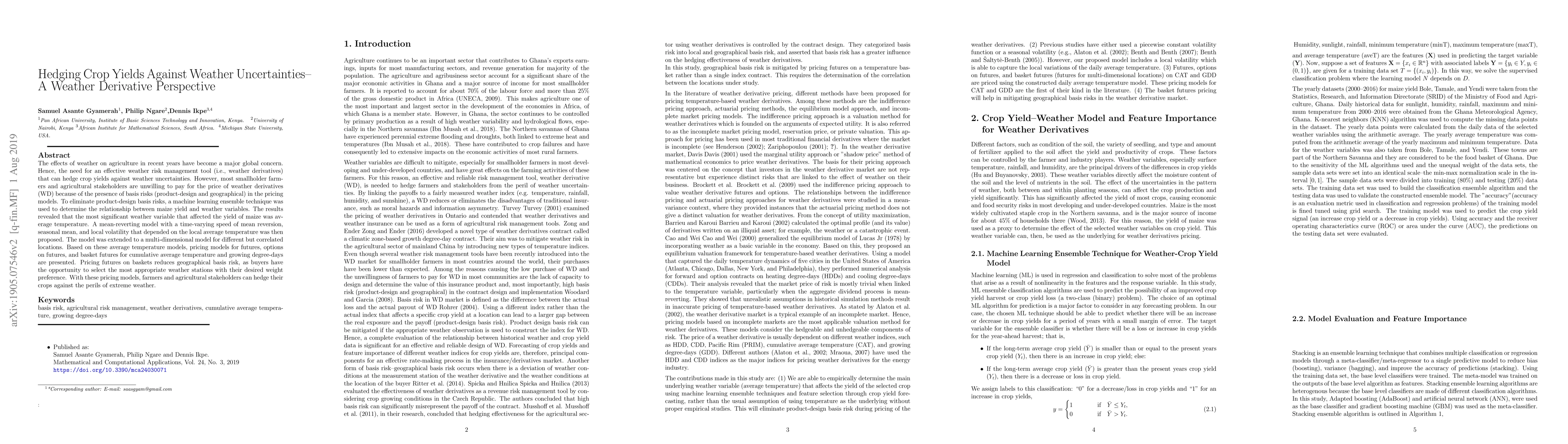 The effects of weather on agriculture in recent years have become a major global concern. Hence, the need for an effective weather risk management tool (i.e., weather derivatives) that can hedge crop yields against weather uncertainties. However, most smallholder farmers and agricultural stakeholders are unwilling to pay for the price of weather derivatives (WD) because of the presence of basis risks (product-design and geographical) in the pricing models. To eliminate product-design basis risks, a machine learning ensemble technique was used to determine the relationship between maize yield and weather variables. The results revealed that the most significant weather variable that affected the yield of maize was average temperature. A mean-reverting model with a time-varying speed of mean reversion, seasonal mean, and local volatility that depended on the local average temperature was then proposed. The model was extended to a multi-dimensional model for different but correlated locations. Based on these average temperature models, pricing models for futures, options on futures, and basket futures for cumulative average temperature and growing degree-days are presented. Pricing futures on baskets reduces geographical basis risk, as buyers have the opportunity to select the most appropriate weather stations with their desired weight preference. With these pricing models, farmers and agricultural stakeholders can hedge their crops against the perils of extreme weather.