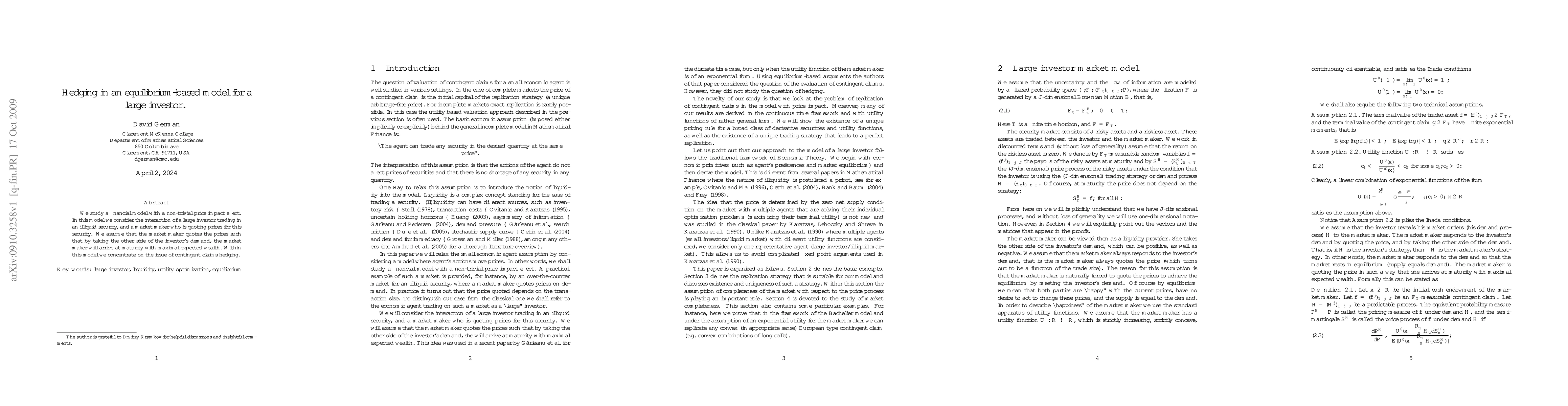 This paper examines a financial model where a large investor trades in an illiquid security, interacting with a market maker who aims to maximize expected wealth. The study focuses on the hedging strategies for contingent claims in this equilibrium-based framework.