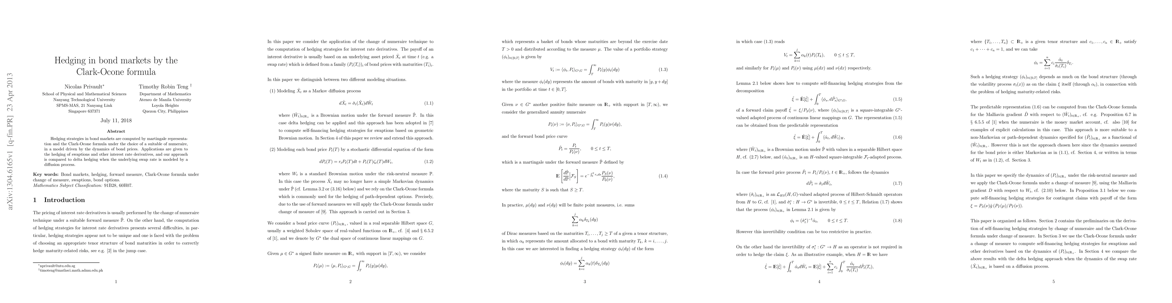 This paper explores hedging strategies in bond markets using the Clark-Ocone formula and martingale representation, focusing on the dynamics of bond prices. It applies these methods to the hedging of swaptions and other interest rate derivatives, comparing the results to delta hedging based on a diffusion process for the underlying swap rate.