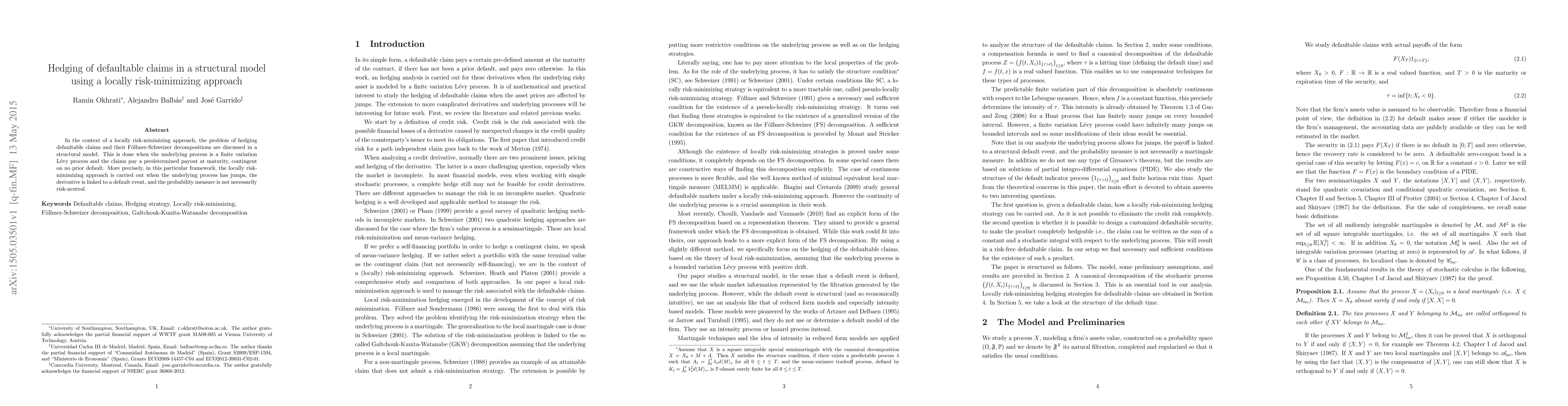 This paper explores hedging defaultable financial claims using a locally risk-minimizing approach within a structural model, where the underlying process is a finite variation Lévy process with jumps, and the claims depend on the absence of prior default. The analysis considers scenarios where the probability measure is not risk-neutral.