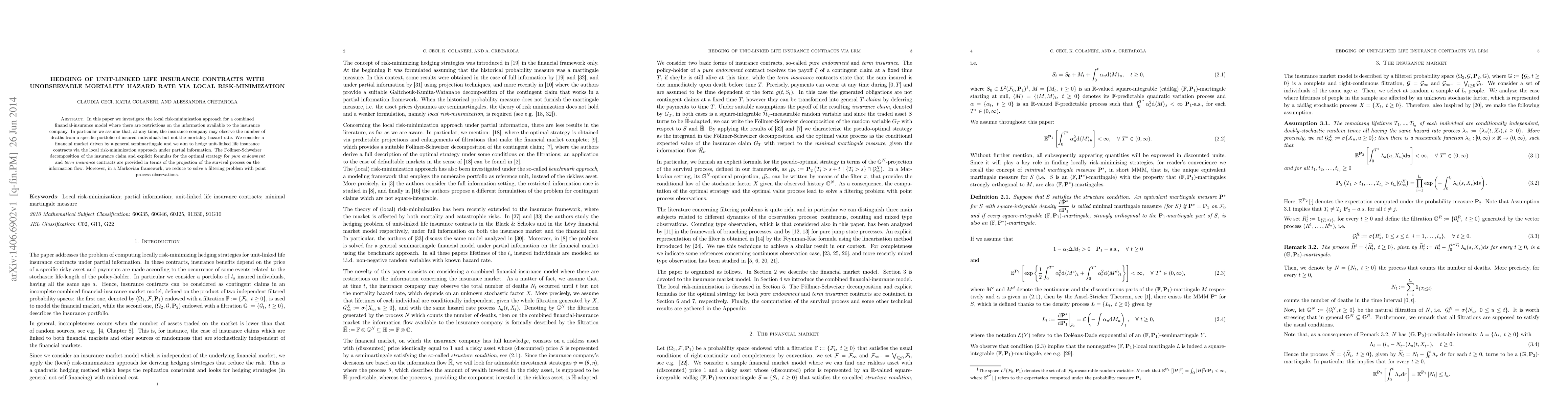 This paper explores the local risk-minimization approach for hedging unit-linked life insurance contracts under partial information, where the mortality hazard rate is unobservable. It provides explicit formulas for optimal hedging strategies for pure endowment and term insurance contracts based on the projection of the survival process.