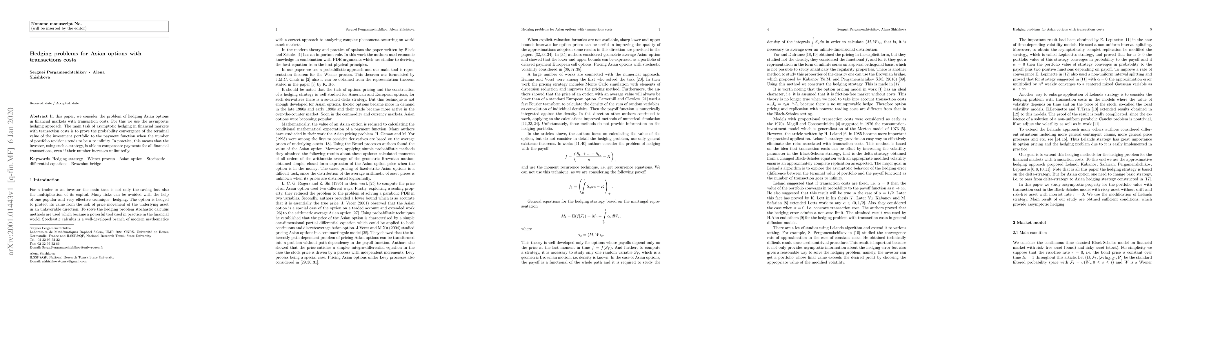 In this paper, we consider the problem of hedging Asian options in financial markets with transaction costs. For this, we use the asymptotic hedging approach. The main task of asymptotic hedging in financial markets with transaction costs is to prove the probability convergence of the terminal value of the investment portfolio to the payment function when the number of portfolio revisions tends to be $n$ to infinity. In practice, this means that the investor, using such a strategy, is able to compensation payments for all financial transactions, even if their number increases unlimitedly.