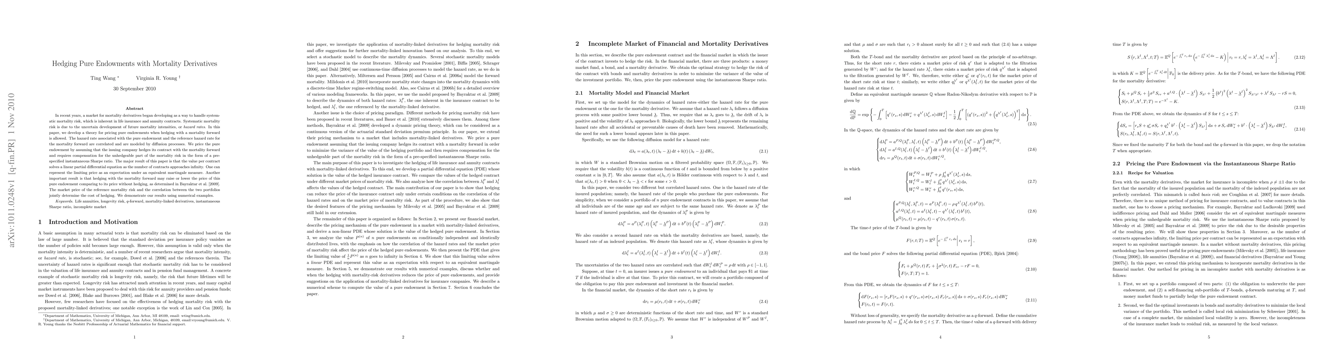 This paper develops a pricing theory for pure endowments when hedging with mortality forwards, showing that the value per contract solves a linear partial differential equation as the number of contracts approaches infinity. The study finds that hedging can either raise or lower the endowment price, depending on the market price of mortality risk and the correlation between hazard rates.