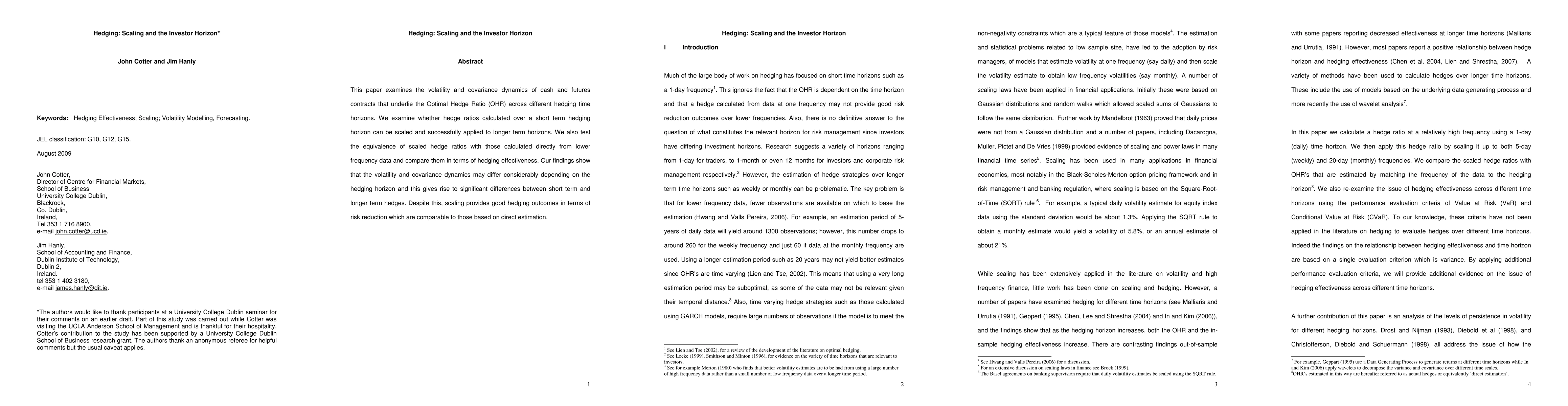 This paper examines the volatility and covariance dynamics of cash and futures contracts that underlie the Optimal Hedge Ratio (OHR) across different hedging time horizons. We examine whether hedge ratios calculated over a short term hedging horizon can be scaled and successfully applied to longer term horizons. We also test the equivalence of scaled hedge ratios with those calculated directly from lower frequency data and compare them in terms of hedging effectiveness. Our findings show that the volatility and covariance dynamics may differ considerably depending on the hedging horizon and this gives rise to significant differences between short term and longer term hedges. Despite this, scaling provides good hedging outcomes in terms of risk reduction which are comparable to those based on direct estimation.