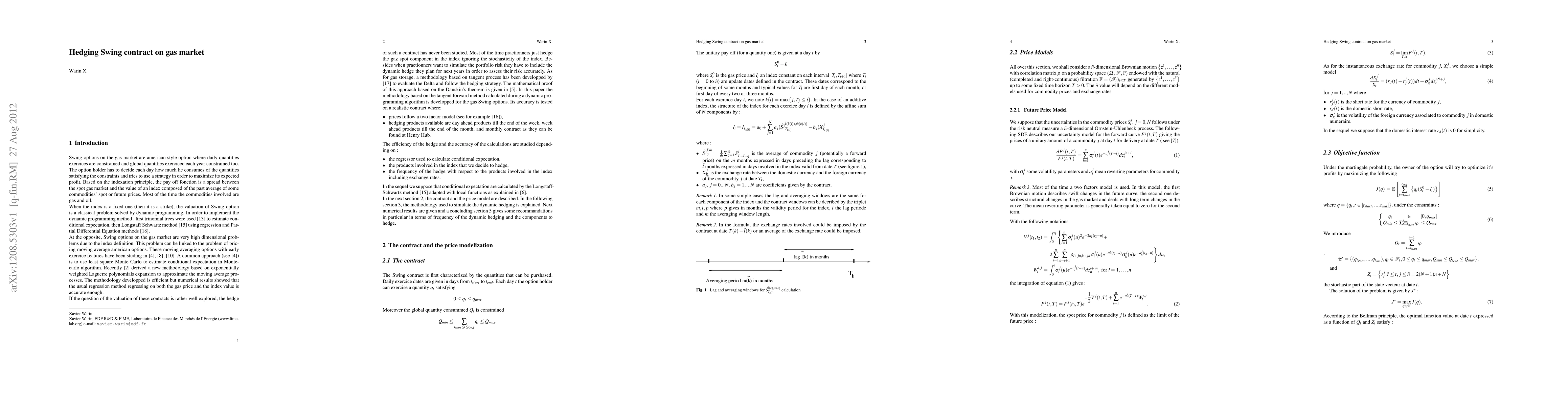 Swing options on the gas market are american style option where daily quantities exercices are constrained and global quantities exerciced each year constrained too. The option holder has to decide each day how much he consumes of the quantities satisfying the constraints and tries to use a strategy in order to maximize its expected profit. The pay off fonction is a spread between the spot gas market and the value of an index composed of the past average of some commodities spot or future prices. We study the valorization and the effectiveness of the dynamic hedging of such a contract.