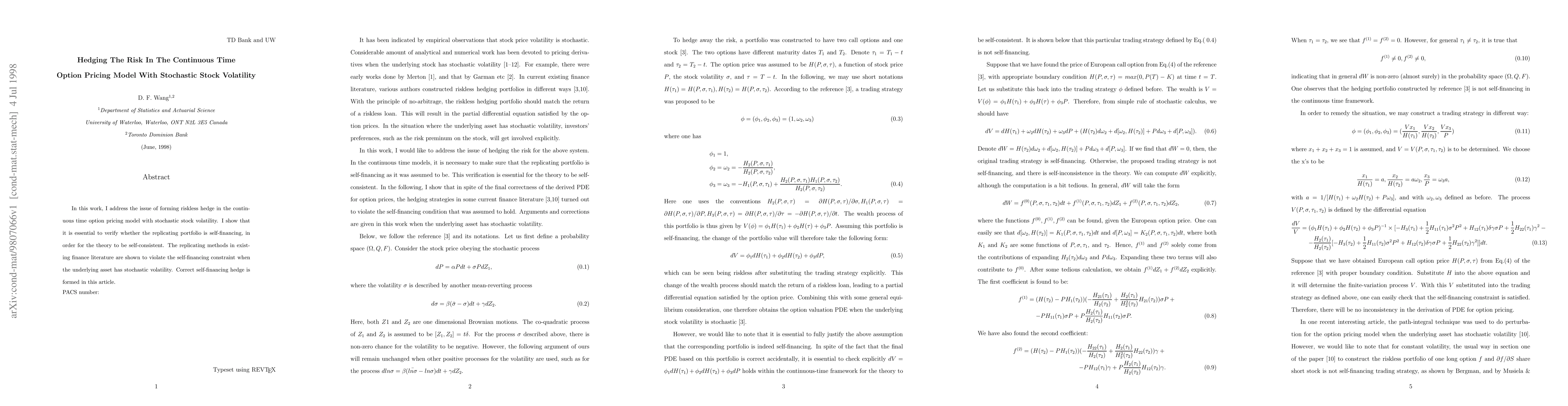 In this work, I address the issue of forming riskless hedge in the continuous time option pricing model with stochastic stock volatility. I show that it is essential to verify whether the replicating portfolio is self-financing, in order for the theory to be self-consistent. The replicating methods in existing finance literature are shown to violate the self-financing constraint when the underlying asset has stochastic volatility. Correct self-financing hedge is formed in this article.