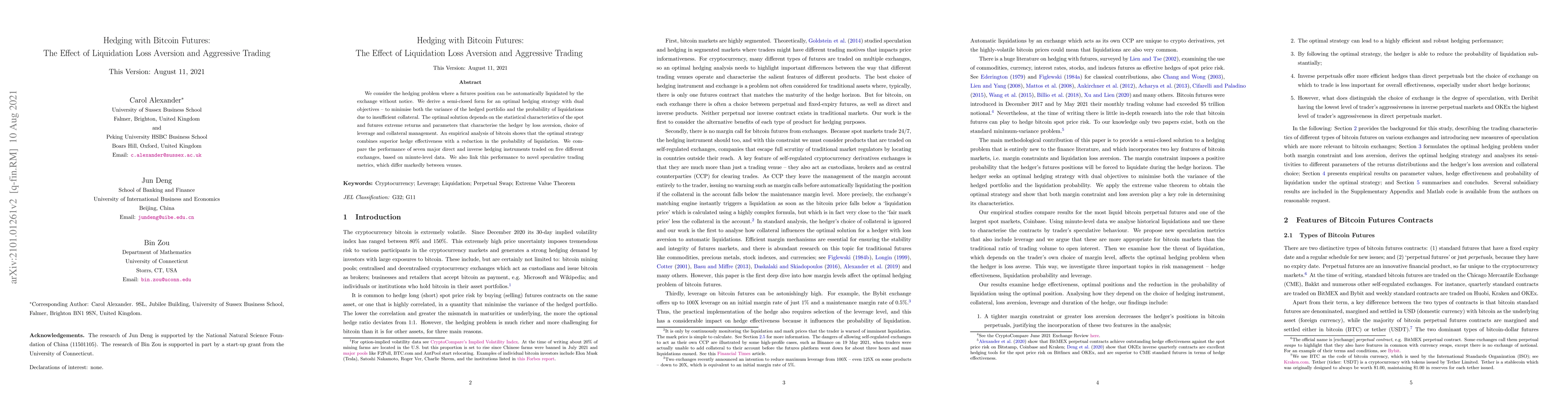 We consider the hedging problem where a futures position can be automatically liquidated by the exchange without notice. We derive a semi-closed form for an optimal hedging strategy with dual objectives - to minimise both the variance of the hedged portfolio and the probability of liquidations due to insufficient collateral. The optimal solution depends on the statistical characteristics of the spot and futures extreme returns and parameters that characterise the hedger by loss aversion, choice of leverage and collateral management. An empirical analysis of bitcoin shows that the optimal strategy combines superior hedge effectiveness with a reduction in the probability of liquidation. We compare the performance of seven major direct and inverse hedging instruments traded on five different exchanges, based on minute-level data. We also link this performance to novel speculative trading metrics, which differ markedly between venues.
