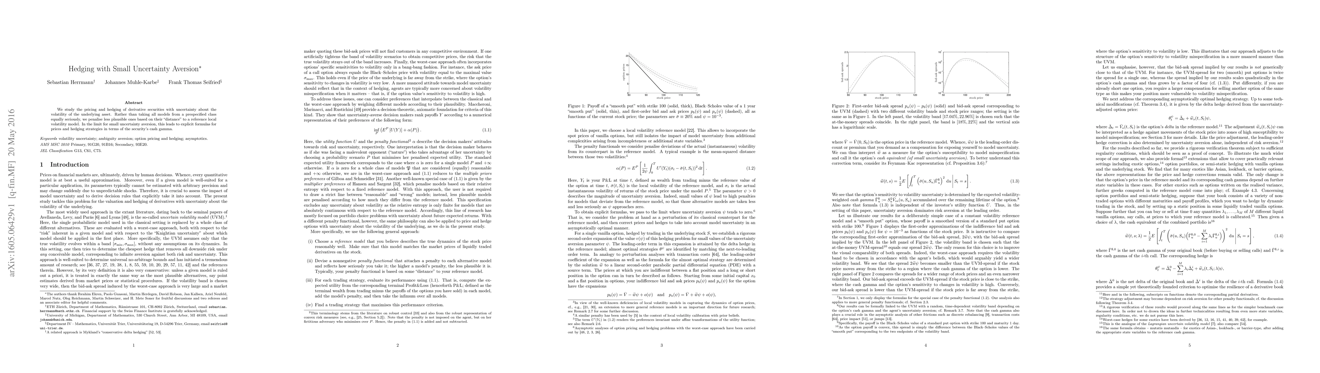 We study the pricing and hedging of derivative securities with uncertainty about the volatility of the underlying asset. Rather than taking all models from a prespecified class equally seriously, we penalise less plausible ones based on their "distance" to a reference local volatility model. In the limit for small uncertainty aversion, this leads to explicit formulas for prices and hedging strategies in terms of the security's cash gamma.