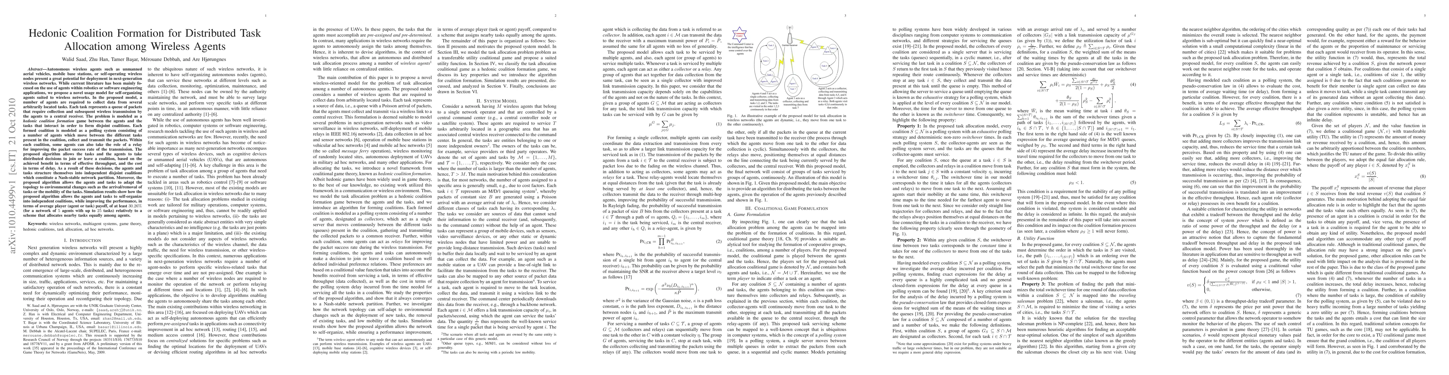 This paper proposes a novel hedonic coalition formation game model for autonomous wireless agents to collaboratively collect and transmit data from distributed tasks to a central receiver. The agents and tasks form disjoint coalitions based on benefit and cost metrics, resulting in a Nash-stable network partition that adapts to environmental changes, achieving at least a 30.26% improvement in average payoff compared to a baseline scheme.