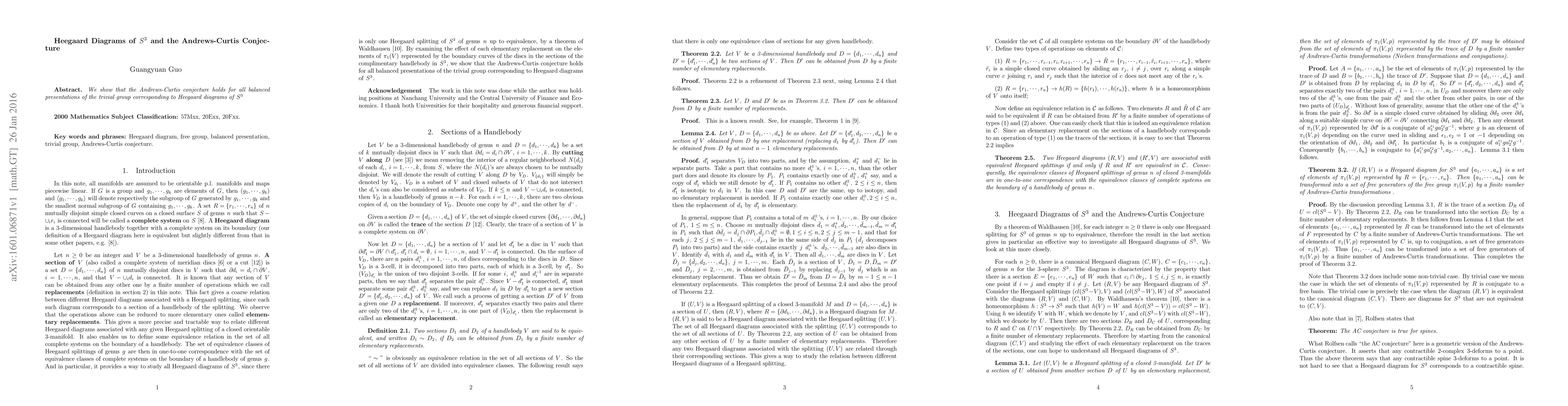 We show that the Andrews-Curtis conjecture holds for all balanced presentations of the trivial group corresponding to Heegaard diagrams of $S^3$.