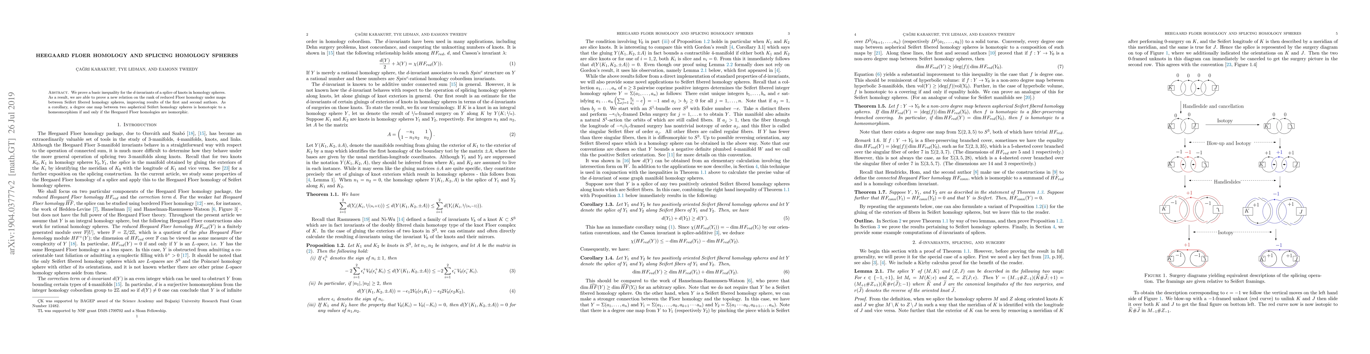 Summary: The paper establishes a new inequality for d-invariants in spliced knots within homology spheres, leading to improved relations on the rank of reduced Heegaard Floer homology, and proves that degree one maps between Seifert homology spheres are homotopic to homeomorphisms if their Heegaard Floer homologies are isomorphic.