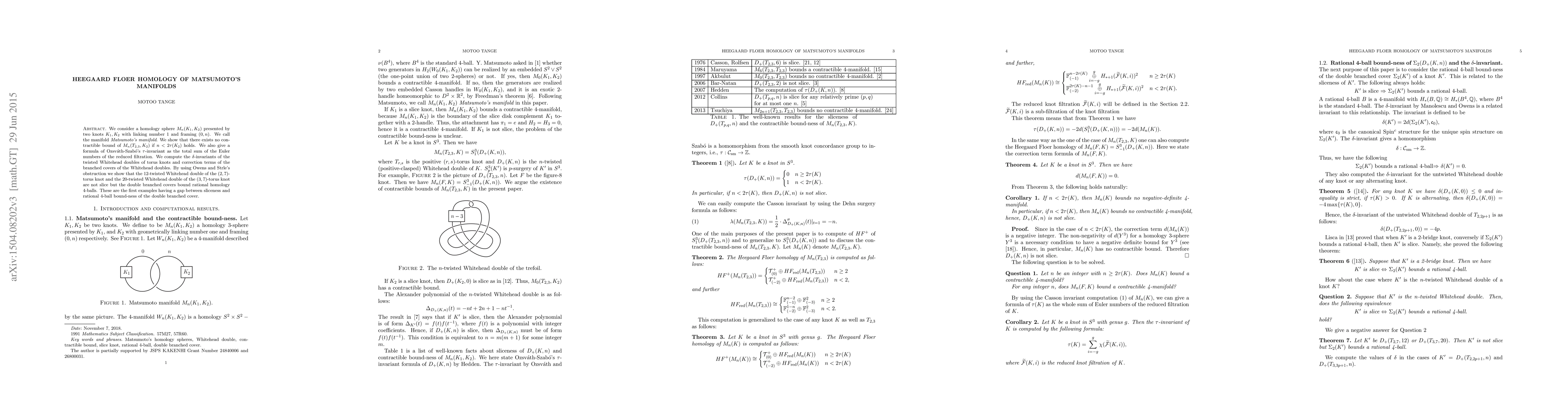 We consider a homology sphere $M_n(K_1,K_2)$ presented by two knots $K_1,K_2$ with linking number 1 and framing $(0,n)$. We call the manifold {\it Matsumoto's manifold}. We show that there exists no contractible bound of $M_n(T_{2,3},K_2)$ if $n<2\tau(K_2)$ holds. We also give a formula of Ozsv\'ath-Szab\'o's $\tau$-invariant as the total sum of the Euler numbers of the reduced filtration. We compute the $\delta$-invariants of the twisted Whitehead doubles of torus knots and correction terms of the branched covers of the Whitehead doubles. By using Owens and Strle's obstruction we show that the $12$-twisted Whitehead double of the $(2,7)$-torus knot and the $20$-twisted Whitehead double of the $(3,7)$-torus knot are not slice but the double branched covers bound rational homology 4-balls. These are the first examples having a gap between sliceness and rational 4-ball bound-ness of the double branched cover.