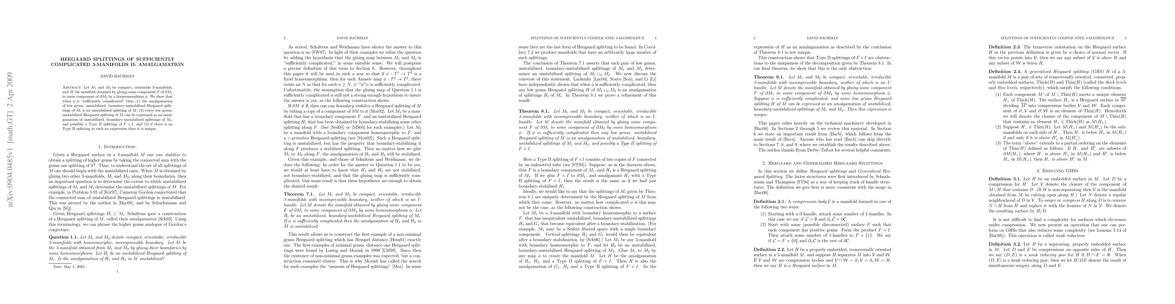 This paper demonstrates that when two compact, orientable 3-manifolds M_1 and M_2 are amalgamated along "sufficiently complicated" boundary components, the resulting manifold M retains specific properties of its Heegaard splittings, ensuring that amalgamations of low genus, unstabilized splittings of M_i correspond uniquely to an unstabilized splitting of M.