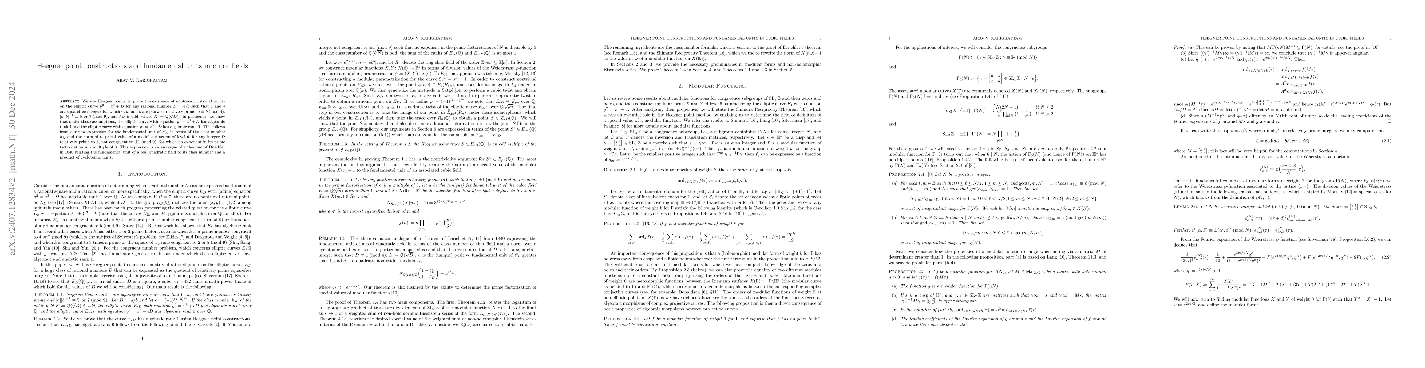 The paper establishes the presence of nontrivial rational Heegner points on specific elliptic curves linked to cubic fields with odd class numbers, and it provides an expression for the fundamental unit in these fields in terms of class numbers and special modular function values.