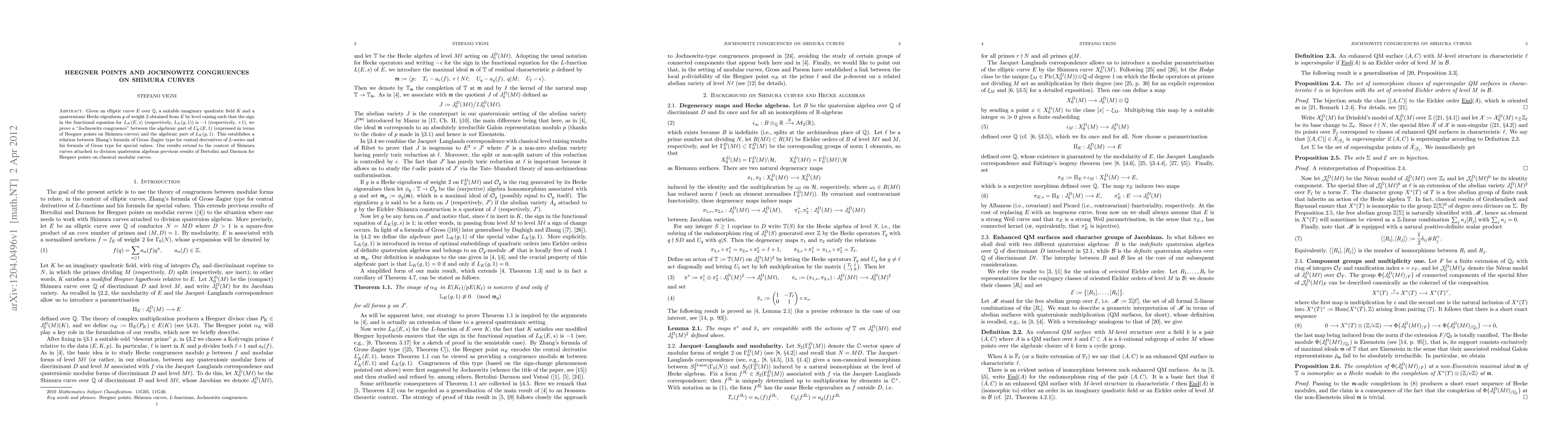 This paper establishes a "Jochnowitz congruence" between the algebraic parts of L-series derived from rational elliptic curves and quaternionic Hecke eigenforms, linking Zhang's Gross-Zagier and Gross type formulas through Heegner points on Shimura curves. The results extend previous findings on Heegner points to Shimura curves associated with division quaternion algebras.
