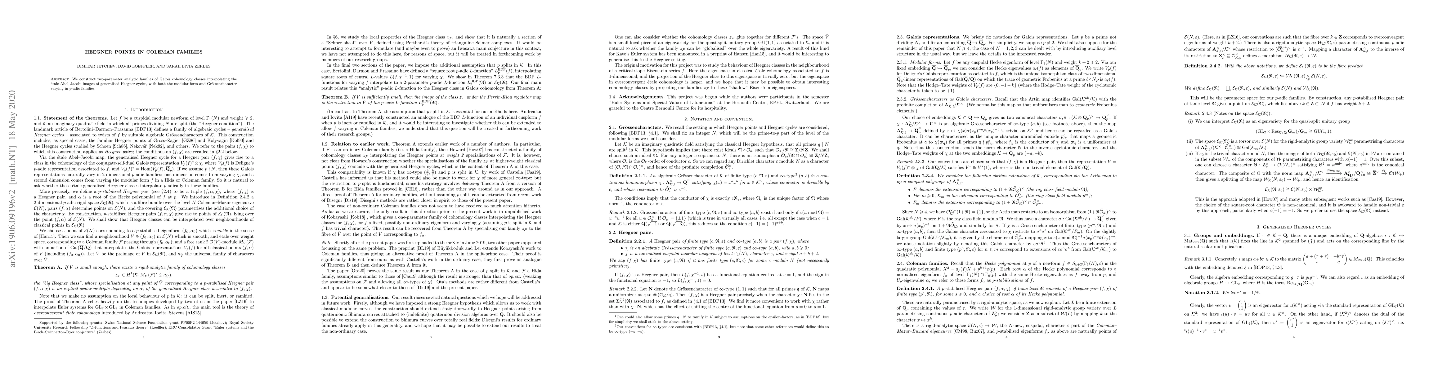 We construct two-parameter analytic families of Galois cohomology classes interpolating the etale Abel--Jacobi images of generalised Heegner cycles, with both the modular form and Grossencharacter varying in p-adic families.