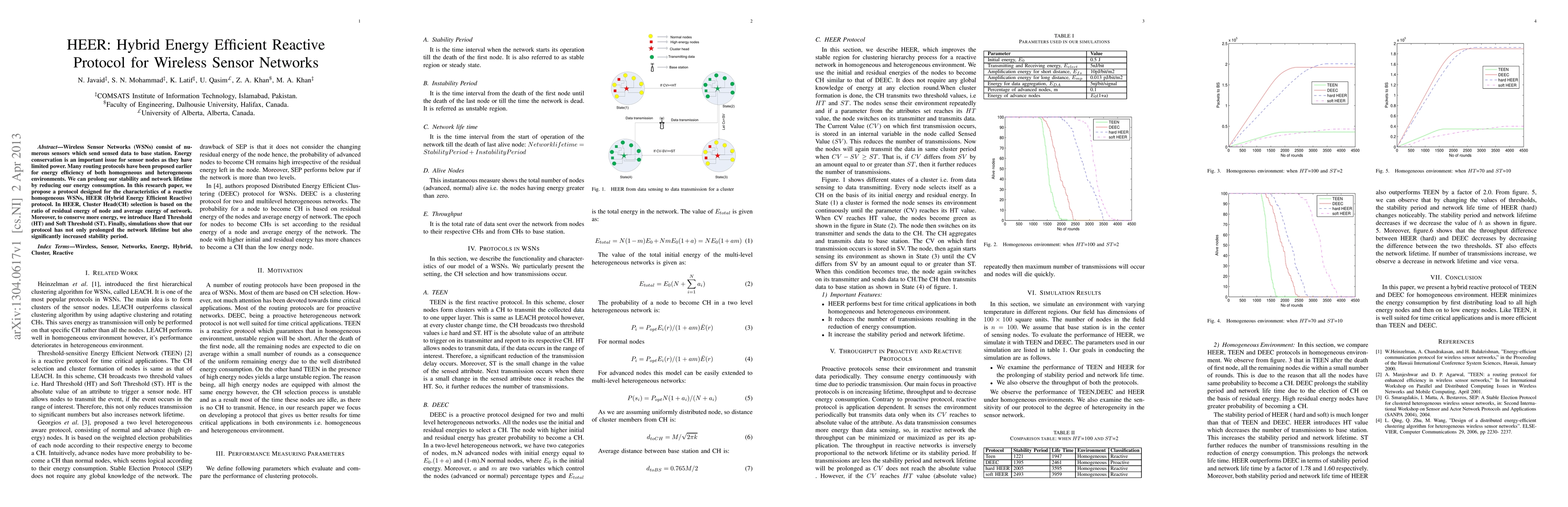Wireless Sensor Networks (WSNs) consist of numerous sensors which send sensed data to base station. Energy conservation is an important issue for sensor nodes as they have limited power.Many routing protocols have been proposed earlier for energy efficiency of both homogeneous and heterogeneous environments. We can prolong our stability and network lifetime by reducing our energy consumption. In this research paper, we propose a protocol designed for the characteristics of a reactive homogeneous WSNs, HEER (Hybrid Energy Efficient Reactive) protocol. In HEER, Cluster Head(CH) selection is based on the ratio of residual energy of node and average energy of network. Moreover, to conserve more energy, we introduce Hard Threshold (HT) and Soft Threshold (ST). Finally, simulations show that our protocol has not only prolonged the network lifetime but also significantly increased stability period.