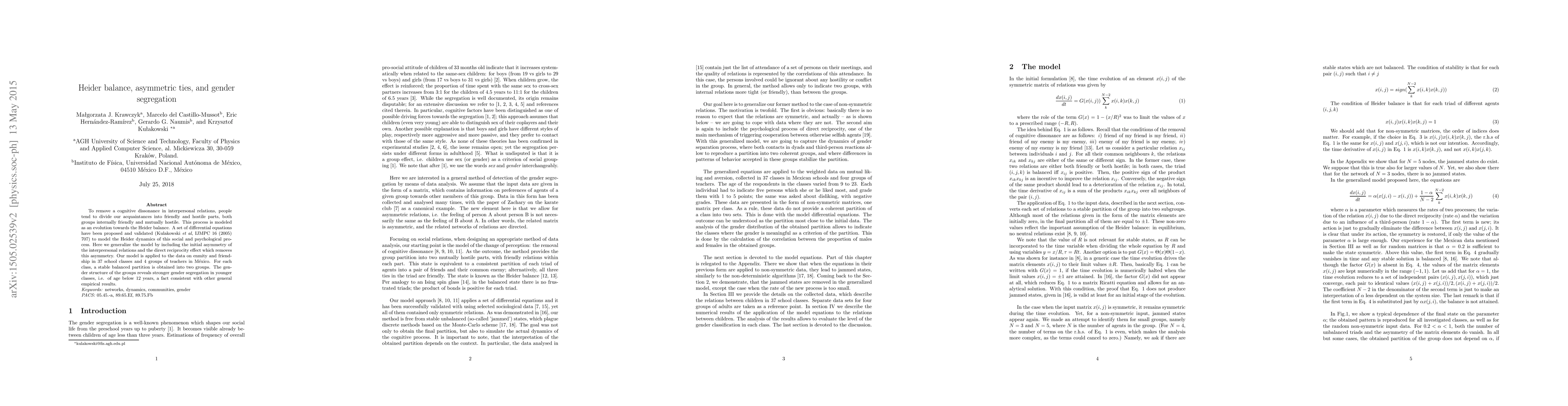 This paper extends a model called Heider balance to account for initial asymmetry in relationships and reciprocity, using it to analyze gender segregation in Mexican school classes and teacher groups. Results show stronger gender segregation in younger classes, aligning with existing empirical findings.