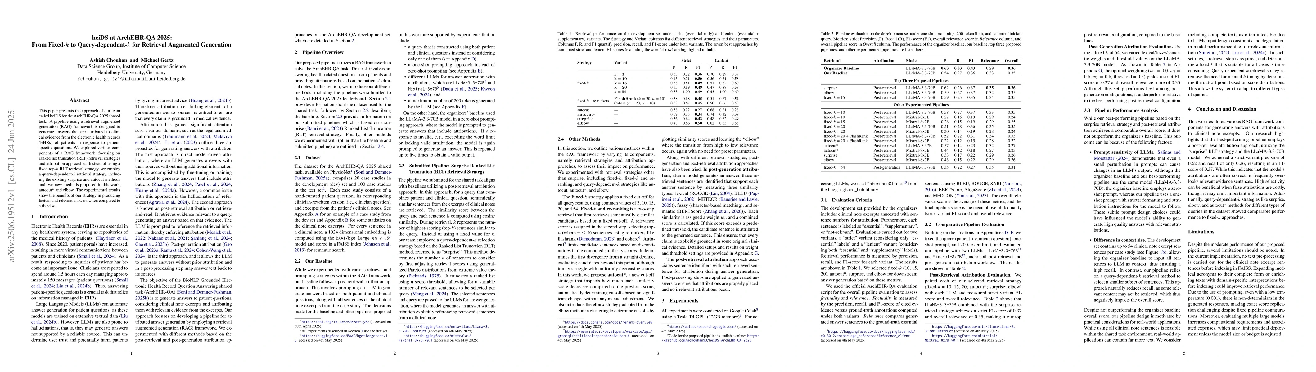 This paper presents the approach of our team called heiDS for the ArchEHR-QA 2025 shared task. A pipeline using a retrieval augmented generation (RAG) framework is designed to generate answers that are attributed to clinical evidence from the electronic health records (EHRs) of patients in response to patient-specific questions. We explored various components of a RAG framework, focusing on ranked list truncation (RLT) retrieval strategies and attribution approaches. Instead of using a fixed top-k RLT retrieval strategy, we employ a query-dependent-k retrieval strategy, including the existing surprise and autocut methods and two new methods proposed in this work, autocut* and elbow. The experimental results show the benefits of our strategy in producing factual and relevant answers when compared to a fixed-$k$.