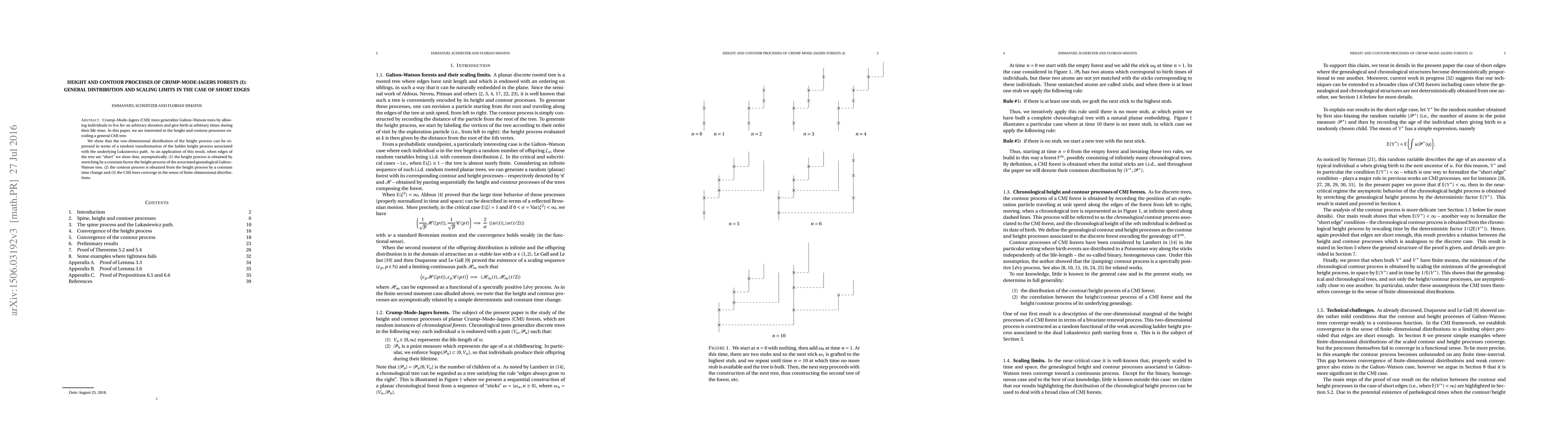 This paper investigates the height and contour processes of Crump-Mode-Jagers (CMJ) forests, showing that their one-dimensional distribution relates to a random transformation of the ladder height process. When tree edges are short, it demonstrates asymptotic scaling limits for height and contour processes, and convergence of CMJ trees in finite-dimensional distributions.