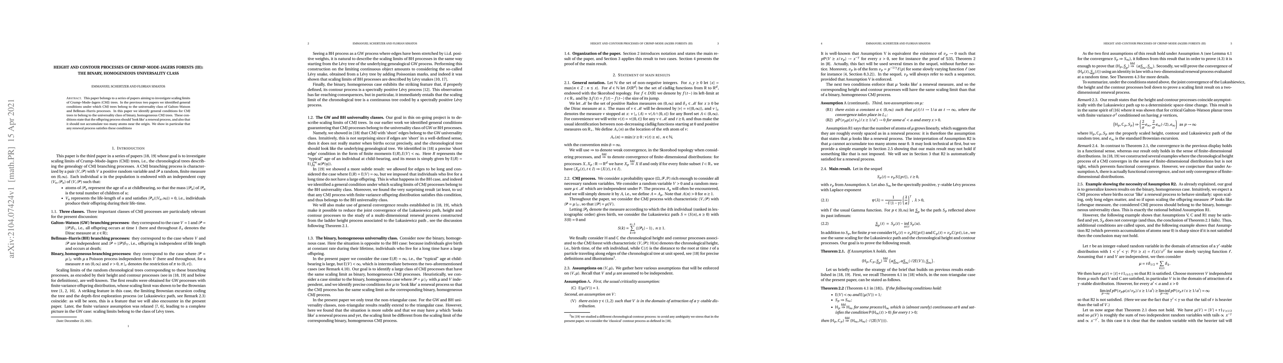 This paper belongs to a series of papers aiming to investigate scaling limits of Crump-Mode-Jagers (CMJ) trees. In the previous two papers we identified general conditions under which CMJ trees belong to the universality class of Galton-Watson and Bellman-Harris processes. In this paper we identify general conditions for CMJ trees to belong to the universality class of binary, homogeneous CMJ trees. These conditions state that the offspring process should 'look like' a renewal process, and also that it should not accumulate too many atoms near the origin. We show in particular that any renewal process satisfies these conditions.