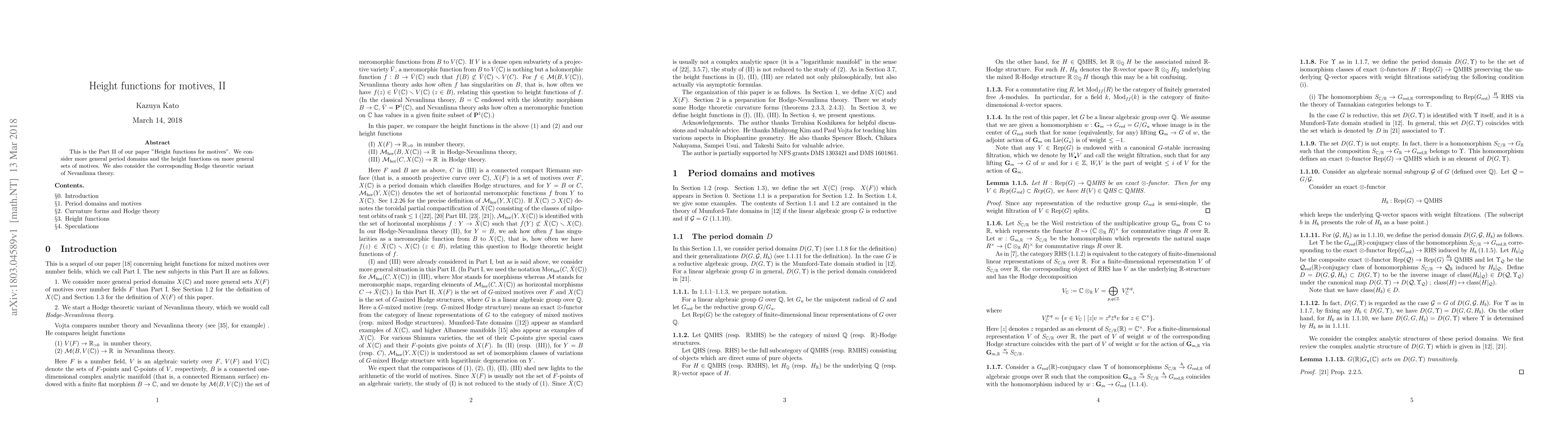 This is the Part II of our paper "Height functions for motives". We consider more general period domains and the height functions on more general sets of motives. We also consider the corresponding Hodge theoretic variant of Nevanlinna theory.
