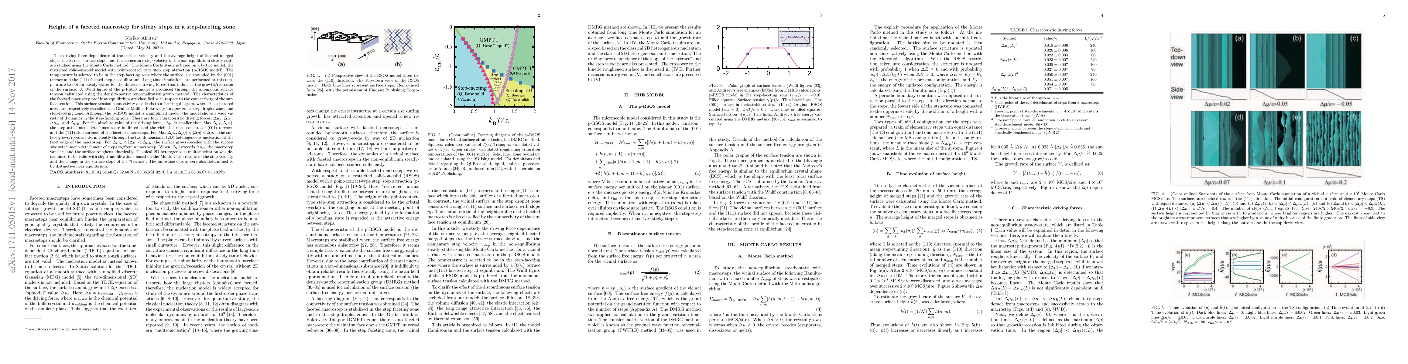The driving force dependence of the surface velocity and the average height of faceted merged steps, the terrace-surface-slope, and the elementary step velocity in the non-equilibrium steady-state are studied using the Monte Carlo method. The Monte Carlo study is based on a lattice model, the restricted solid-on-solid model with point-contact type step--step attraction (p-RSOS model). The temperature is selected to be in the step-faceting zone where the surface is surrounded by the (001) terrace and the (111) faceted step at equilibrium. Long time simulations are performed at this temperature to obtain steady-states for the different driving forces that influence the growth/recession of the surface. A Wulff figure of the p-RSOS model is produced through the anomalous surface tension calculated using the density-matrix renormalization group method. Although the p-RSOS model is a simplified model, the model shows a wide variety of dynamics in the step-faceting zone. There are four characteristic driving forces, $\Delta \mu_y$, $\Delta \mu_f$, $\Delta \mu_{co}$, and $\Delta \mu_R$. For $\Delta \mu_{co}<|\Delta \mu|<\Delta \mu_R$, the surface grows/recedes with the successive attachment-detachment of steps to/from a macrostep. When $|\Delta \mu|$ exceeds $\Delta \mu_R $, the macrostep vanishes and the surface roughens kinetically. Classical 2D heterogeneous multi-nucleation was determined to be valid with slight modifications based on the Monte Carlo results of the step velocity and the change in the surface slope of the "terrace". The finite size effects were also determined to be distinctive near equilibrium.