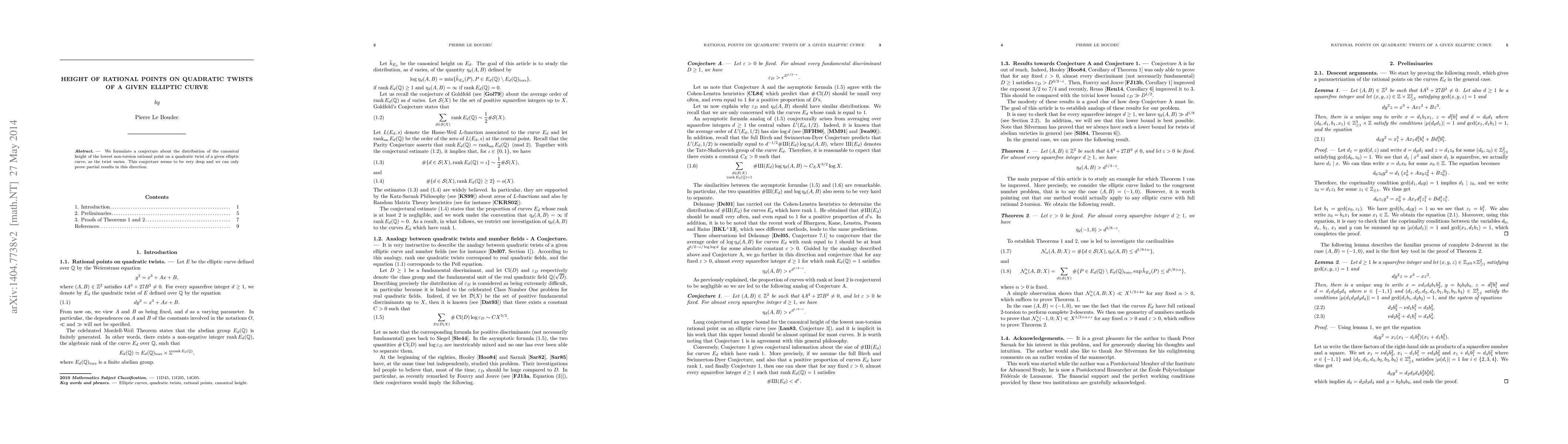 This paper proposes a conjecture regarding the distribution of the canonical height of the lowest non-torsion rational point on quadratic twists of a given elliptic curve. Partial results supporting the conjecture are presented, though a full proof remains elusive.