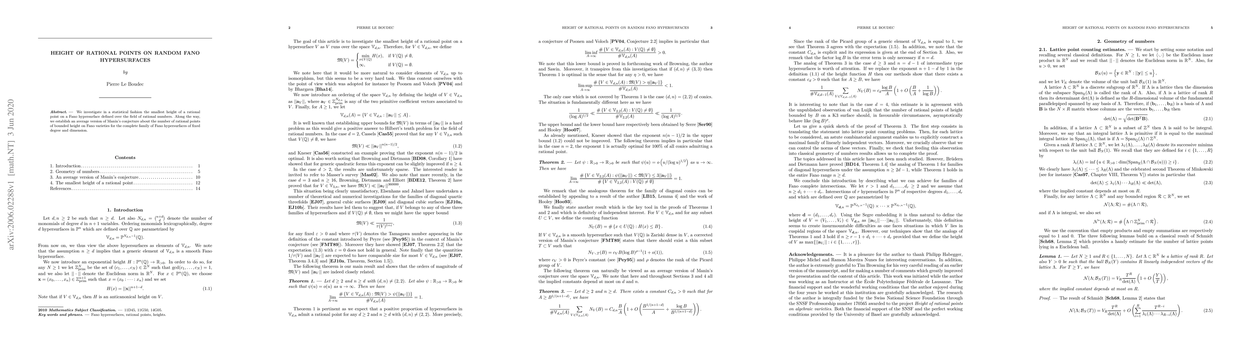 We investigate in a statistical fashion the smallest height of a rational point on a Fano hypersurface defined over the field of rational numbers. Along the way, we establish an average version of Manin's conjecture about the number of rational points of bounded height on Fano varieties for the complete family of Fano hypersurfaces of fixed degree and dimension.