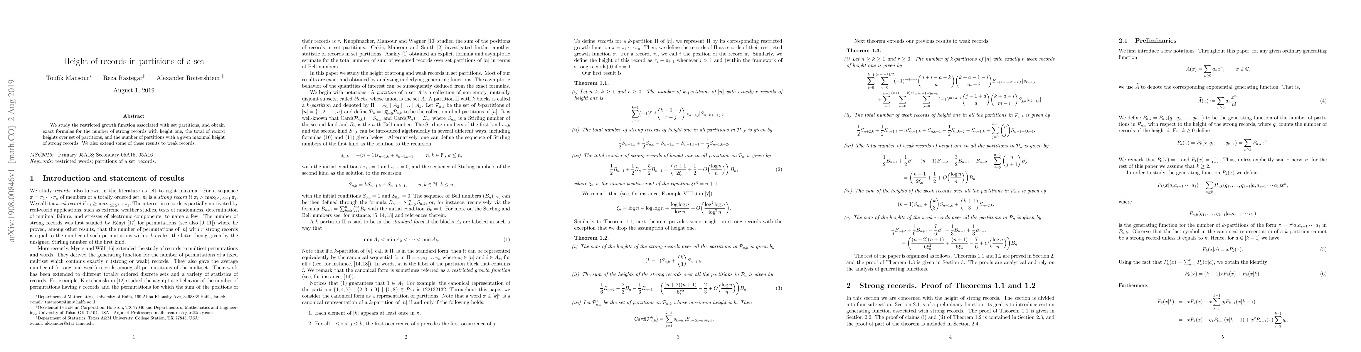 This paper provides exact formulas for the number of strong records with height one, the total record heights in set partitions, and partitions with a specified maximal height of strong records. It also extends some findings to weak records.