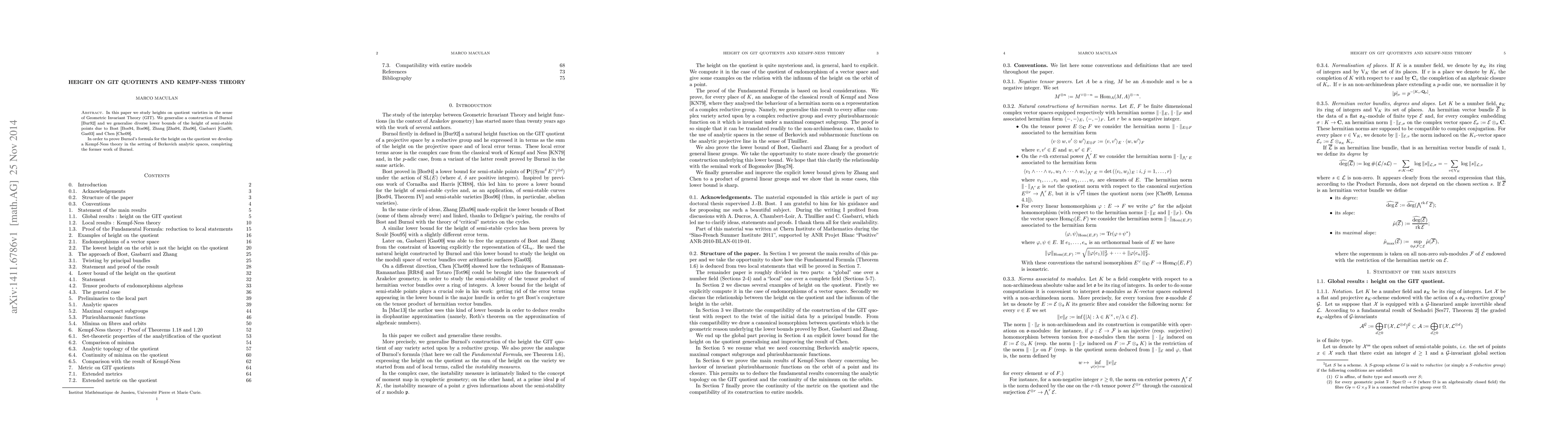 In this paper we study heights on quotient varieties in the sense of Geometric Invariant Theory (GIT). We generalise a construction of Burnol and we generalise diverse lower bounds of the height of semi-stable points due to Bost, Zhang, Gasbarri and Chen. In order to prove Burnol's formula for the height on the quotient we develop a Kempf-Ness theory in the setting of Berkovich analytic spaces, completing the former work of Burnol.