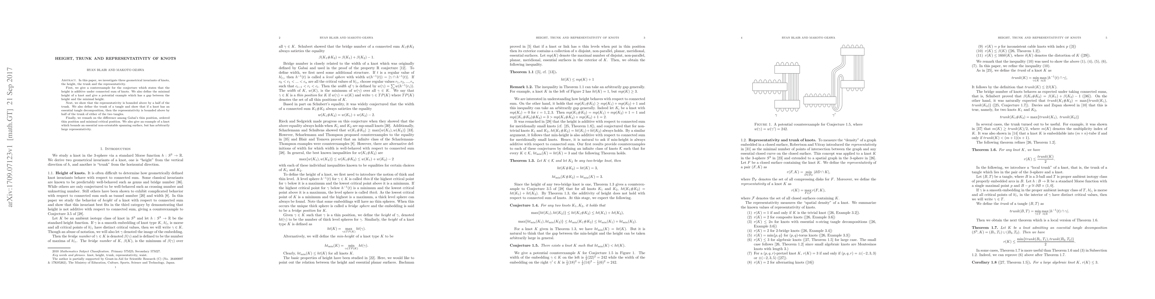 The paper investigates geometrical invariants of knots, specifically height, trunk, and representativity, through various theorems and counterexamples.