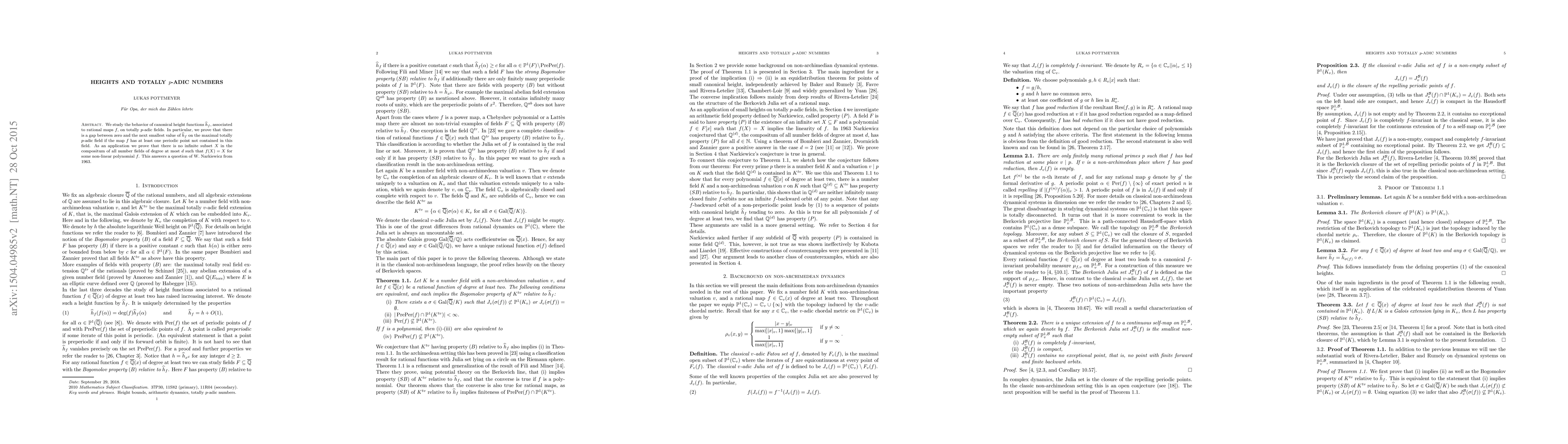 This paper investigates the canonical height functions associated with rational maps over totally $p$-adic fields, proving a gap between zero and the next smallest value of these functions if the map has a periodic point. It also resolves a 1963 question by Narkiewicz by showing no infinite self-mapping subset exists under non-linear polynomials in the compositum of number fields of bounded degree.