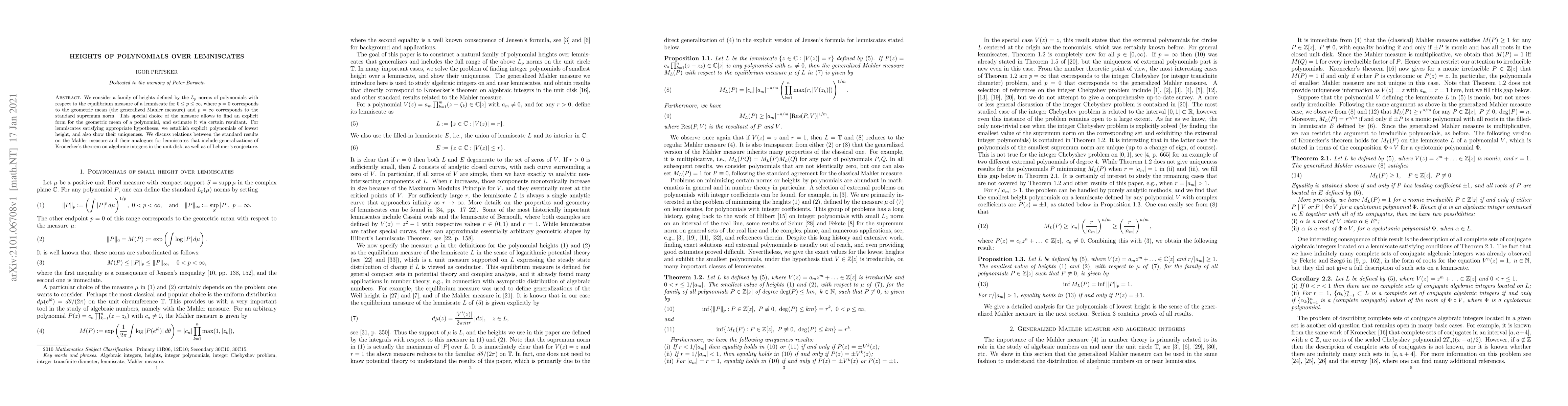 We consider a family of heights defined by the $L_p$ norms of polynomials with respect to the equilibrium measure of a lemniscate for $0 \le p \le \infty$, where $p=0$ corresponds to the geometric mean (the generalized Mahler measure) and $p=\infty$ corresponds to the standard supremum norm. This special choice of the measure allows to find an explicit form for the geometric mean of a polynomial, and estimate it via certain resultant. For lemniscates satisfying appropriate hypotheses, we establish explicit polynomials of lowest height, and also show their uniqueness. We discuss relations between the standard results on the Mahler measure and their analogues for lemniscates that include generalizations of Kronecker's theorem on algebraic integers in the unit disk, as well as of Lehmer's conjecture.