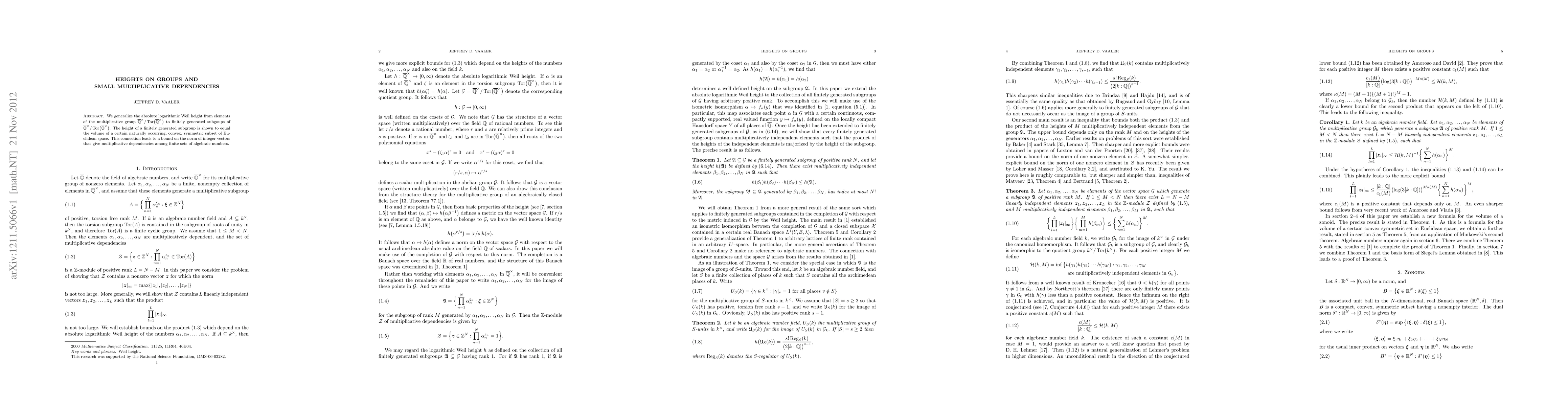 We generalize the absolute logarithmic Weil height from elements of the multiplicative group of algebraic numbers modulo torsion, to finitely generated subgoups. The height of a finitely generated subgroup is shown to equal the volume of a certain naturally occurring, convex, symmetric subset of Euclidean space. This connection leads to a bound on the norm of integer vectors that give multiplicative dependencies among finite sets of algebraic numbers.