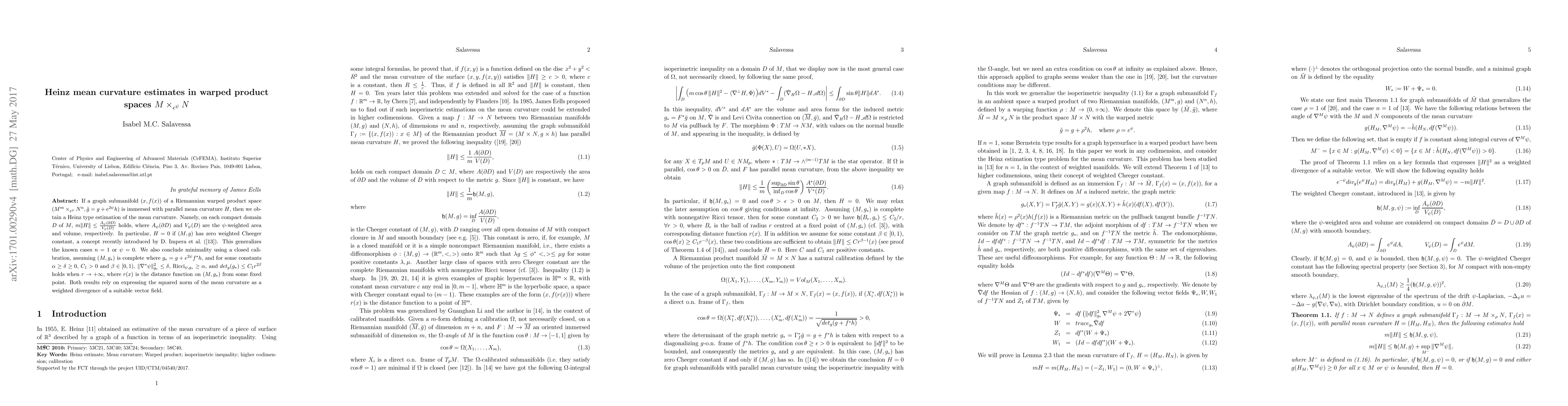 This research paper presents Heinz mean curvature estimates for graph submanifolds in Riemannian warped product spaces. It introduces a weighted area and volume concept, proving that parallel mean curvature H satisfies m||H||≤A_ψ(∂D)/V_ψ(D) on compact domains D of M. The study generalizes previous cases and concludes minimality under specific conditions, utilizing a weighted divergence expression of the mean curvature's squared norm.
