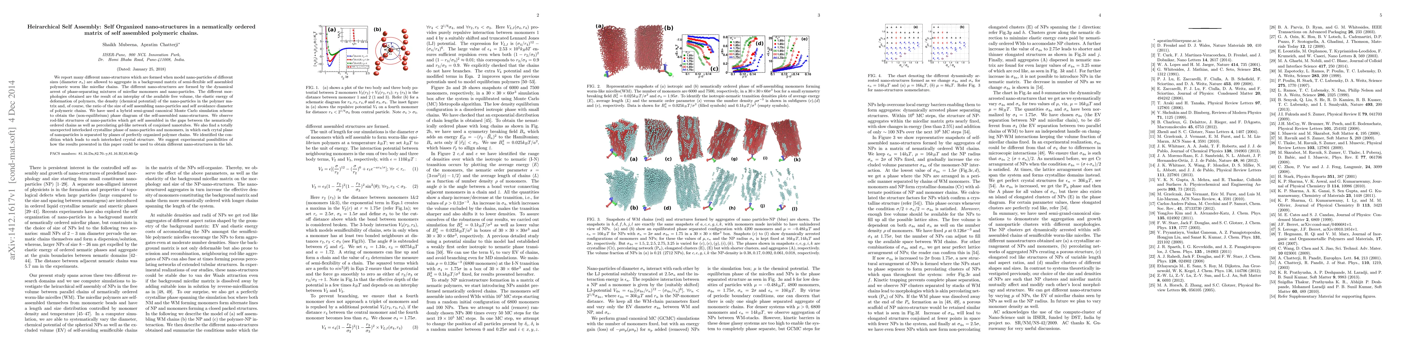This paper explores the formation of diverse nano-structures through hierarchical self-assembly of nanoparticles within a nematically ordered matrix of polymeric chains. Using simulations, it reveals unexpected interlocked crystalline phases and suggests experimental methods to replicate these structures.